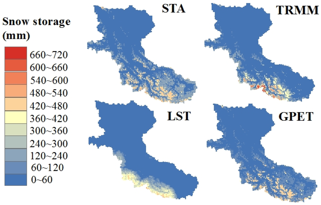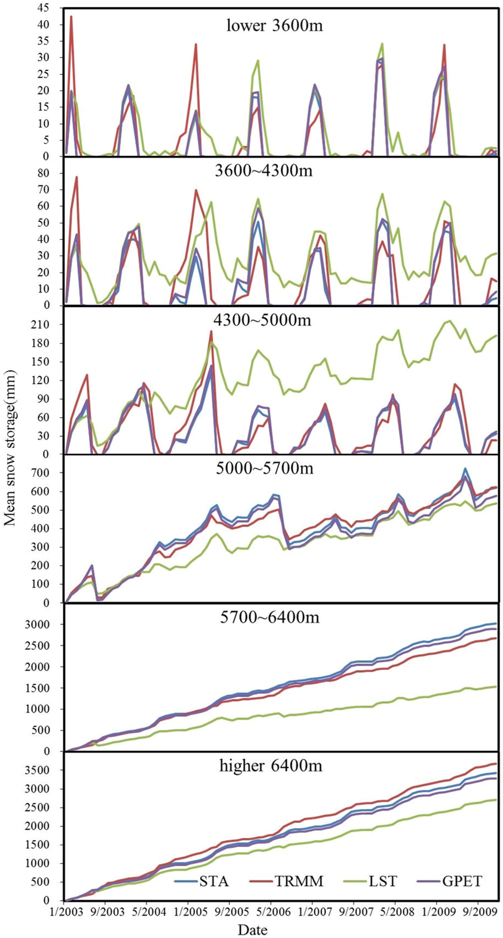 The application of TRMM made the differentiation of snow storage distribution more evident, resulting in large values in higher elevation regions. Corresponding to a TRMM precipitation overestimation of 12% higher than 6400 m and an underestimation of 18% at 5000 m–5700 m, the TRMM model resulted in snow storage changes of 12.3% and −9.4% compared with the STA model.