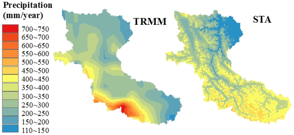 Spatial distributions of the annual mean precipitation based on TRMM and SBD in Yarkant River basin from 2003–2009.