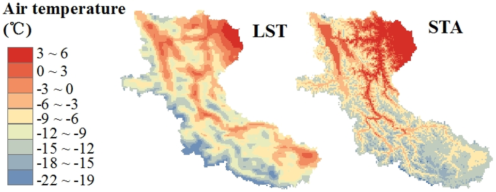 As for temperature, Moderate Resolution Imaging Spectroradiometer (MODIS http://trmm.gsfc.nasa.gov/) MOD11C1 daily LST data was used with a spatial resolution of 0.05°. Version 4.1 was chosen because of its effectiveness in semi-arid and arid regions [31]. Daily mean air temperature data was needed as the MIKE SHE input. Previous research confirmed that there is a good linear relationship between LST and air temperature [32,33]. Because Shache station is missing LST data, only Tashkurgan and Pishan station data were plotted to verify this relationship (Figure 3).