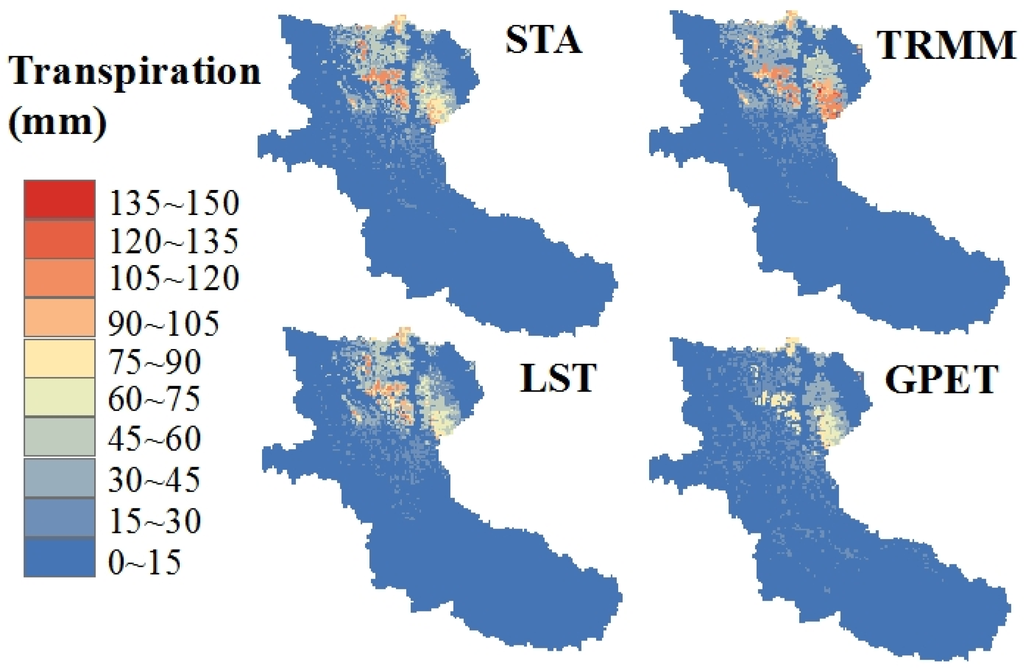 The spatial distributions of simulated annual mean transpiration based on the STA, TRMM, LST and GPET models in the Yarkant River basin from 2003–2009.