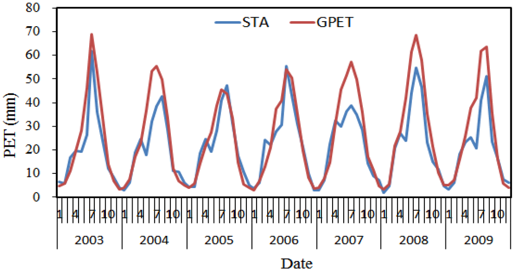Based on Figure 5 and Figure 6, there is little or no variation between STA and GPET because PET does not significantly affect evapotranspiration (Table 6). Using plant transpiration (Table 6) as an example (Figure 9) to analyse the effect of PET, compared with the STA model the most significant variations occurred in the GPET model, with reductions in high transpiration regions covered by evergreen needle-leaved trees and closed-open herbaceous areas (Figure 2a), exhibiting change rates of 33.4% and 35.6%, respectively. These variations may be due to the different PET values in the two models because of the low resolution of the GPET data (1°). The spatial distribution features were not evident. Only the monthly temporal distributions of the two PET data sets are compared in Figure 10. The annual mean PET estimates in the Yarkant River basin were 256.5 mm and 309.2 mm, based on the two data sets. The higher PET estimated by the GPET model mainly occurred from May to August, increasing at a rate of 34.78%. Based on the MIKE SHE calculation, transpiration was closely related to land use parameters (i.e., LAI and RD). In the GPET model, the larger input PET values caused more evapotranspiration dissipation and decreased the simulation performance. To decrease evapotranspiration, the transpiration was reduced through adjusting LAI and RD, which were chosen as calibration parameters (Table 4).