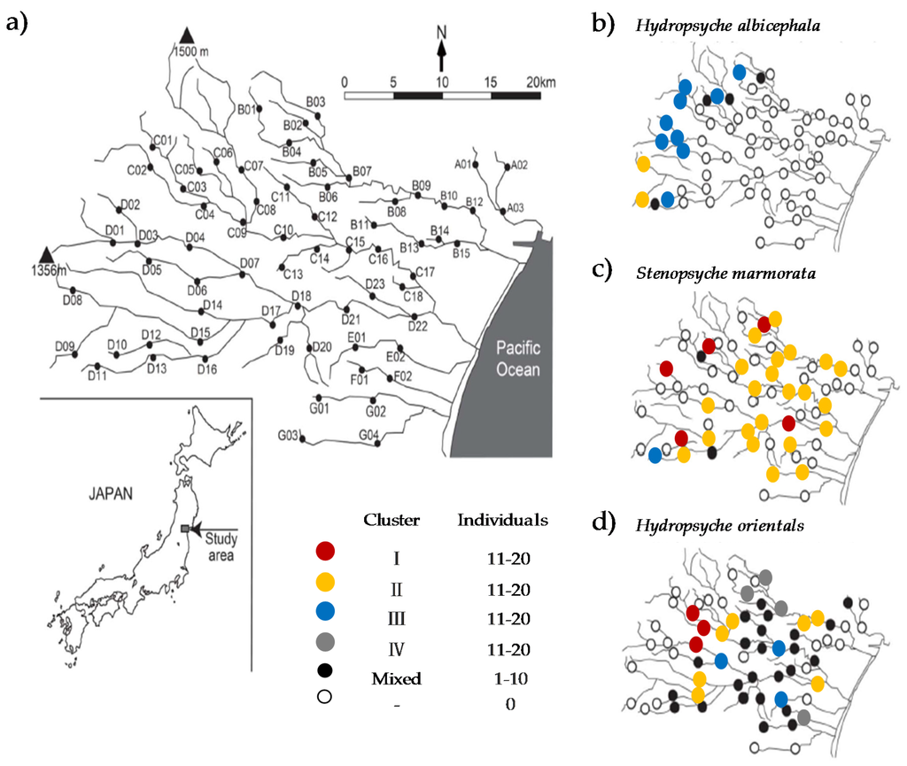 (a) Map of sampling sites; (b) group size of individuals collected within same cluster at each sampling site according to SOM (Figure 4) for Hydropsyche albicephala; (c) Stenopsyche marmorata, (d) Hydropsyche orientals. The color of the solid circles indicates a cluster in which 11 or more individuals (the total number of individuals in one site was 20) were grouped together, whereas the black circles mean the individuals are equal to or less than 10. The white circle stands for no individual collected at the sampling sites. The symbols, I, II, III and IV, in the legend indicate cluster names shown in Figure 4. Modified from Watanabe et al. [].