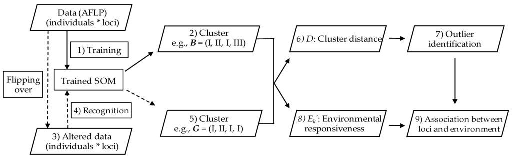In our study, however, we focused on investigating the specific contribution of each locus (variable) on the cluster patterns. We adopted a recognition process after training (Figure 2). By examining the result of recognition on the trained SOM locally, the patterns of cluster change were specifically observed locus by locus for each individual (Figure A1). Further associations between loci and environmental variable were revealed according to this type of SOM training followed by recognition (Figure 9). However, variability would still be obtained in initial training if random conditions were different in different trials. Since convergence is obtained adaptively through a random process, as stated above, a minor degree of variability would exist in either clustering or determining outliers, although the overall trends would be similar. Further research is required to optimize the variability caused by randomness in SOM training in relationship with outlier determination in the future.