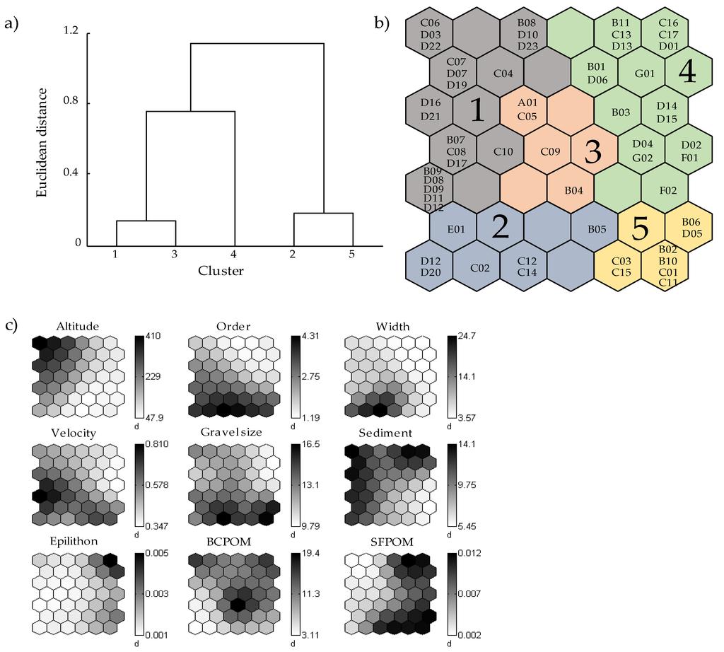 Based on the SOM trained with nine natural environmental variables (57 sample sites in six streams), grouping was observed according to cluster analysis (Ward linkage method) (Figure 3a). Five clusters were formed based on the dendrogram. Clusters 1, 3, and 4 were observed at the upper area, corresponding with somewhat higher levels in altitude, sediment, BCPOM, and SFPOM according to profiles on the component plane (Figure 3c). Clusters 2 and 5 were placed at the lower area matching higher levels of order, width, mean gravel size, and SFPOM. However, the degree of matching varied according to clusters and environmental variables in both upper and lower groups. For instance, SFPOM was high in both upper and lower groups (Figure 3c). The sampling sites appeared to be mixed in all clusters (Figure 3b). There seemed to be no major environmental factors in determining the overall gradients at the surveyed area according to a visualization of the component profiles (Figure 3c). Habitats are variably characterized by heterogeneous environmental conditions at the sampling sites.
