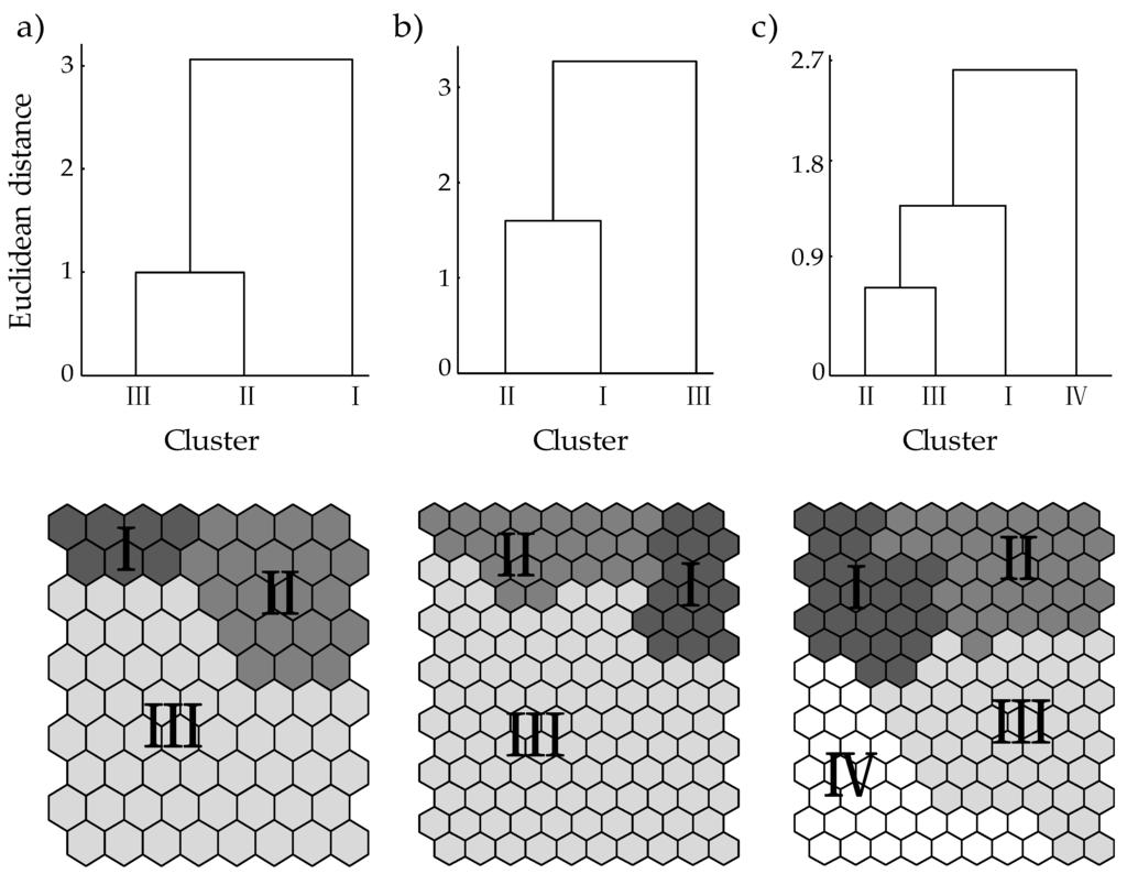 The SOM learning process was conducted under a Matlab environment (The Mathworks, R2009) using the SOM Toolbox [] developed by the Laboratory of Information and Computer Science at the Helsinki University of Technology (http://www.cis.hut.fi/). The training was performed following suggestions made by the SOM Toolbox and Park et al. []. To reveal the degree of association between the SOM units, Ward’s linkage method [,] was used to cluster the sample units according to the Euclidean distance.