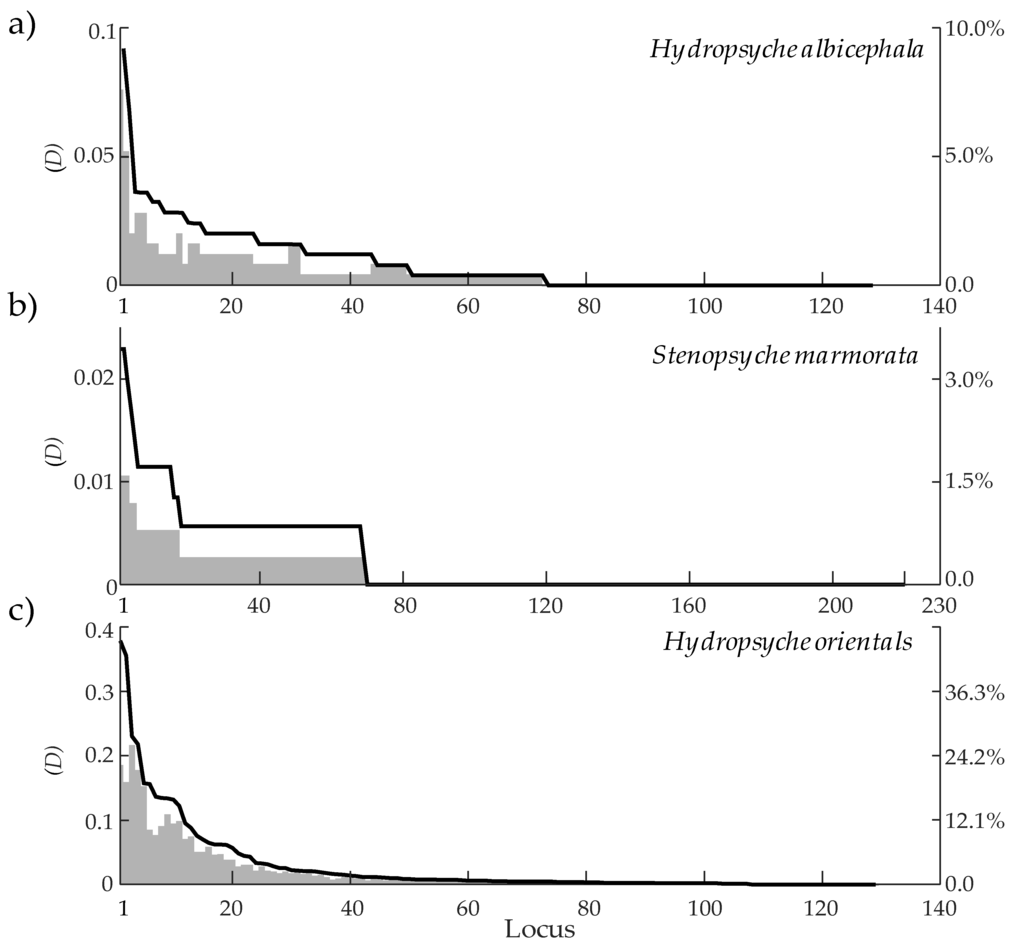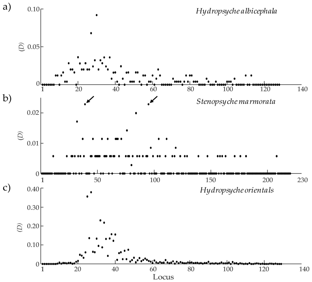 When frequencies were presented across different levels of D in the histogram, the maximum value was observed with the minimum level of D in different species (Figure 7). Frequencies sharply decreased in all species as D increased along the x axis. According to the frequency distribution shown in Figure 7, the outlier loci that responded strongly to data alteration were identified. In order to determine outliers, the 90th percentile was set as the threshold for each species (vertical lines in Figure 7) (see Section 2.3); the loci showing higher levels of D than the threshold were chosen as outlier loci in this study. Since many individuals showed the same value of D at the boundary of the 90th percentile line for S. marmorata, the grouped individuals that crossed the boundary of the percentile line were not included as outliers for S. marmorata. The numbers of outlier loci were 14, 17, and 12 for H. albicephela, S. marmorata, and H. orientalis, respectively (Table 2), and the outlier loci were listed in Table A1.