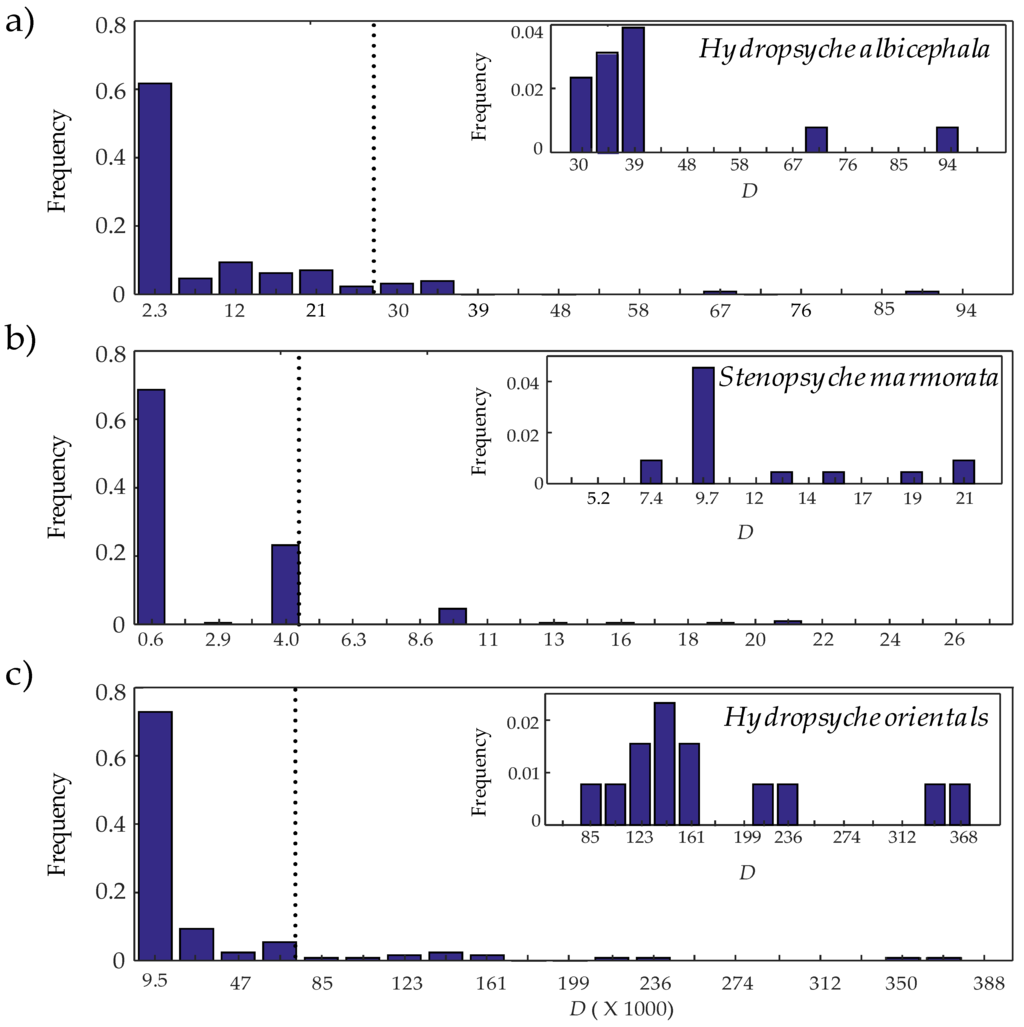 Histogram of cluster distance (D) in Hydropsyche albicephala (a); Stenopsyche marmorata (b); and Hydropsyche orientals (c) after recognition. The unit was expressed as 1000 times the actual values. The dotted vertical lines indicate the threshold for determining outliers (90th percentile). Insets show the upper range above the threshold.