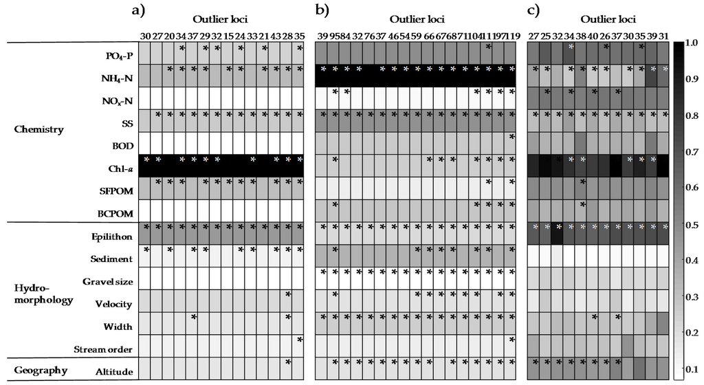 Environmental responsiveness in association with outlier loci in Hydropsyche albicephala (a); Stenopsyche marmorata (b); and Hydropsyche orientals (c). The gray levels indicate the Ek’ value according to the maximum across environmental variables in each species (H. albicephela: Chl-a (1.28), S. marmorata: NH4–N (0.76), and H. orientalis: Chl-a (0.22)). The asterisk at the upper right corner of each cell indicates the significance (p < 0.05) of environmental variables according to the Kolmogorov-Smirnov test. For convenience of visualization, white asterisks are listed when Ek’ is equal to or greater than 0.6; otherwise there is black asterisk.