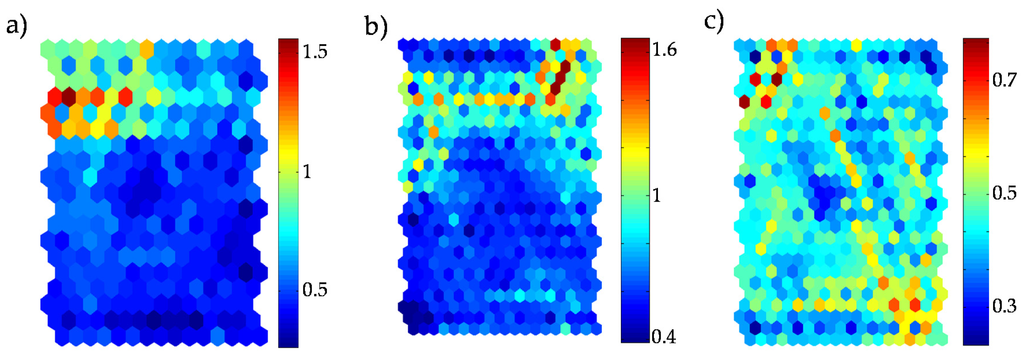 According to Vesanto’s rule [], the number of map units (m) could be approximately determined as m = 5, where n is the number of sample units. Starting from the initial value proposed by this rule, quantization error (QE) and topographic error (TE) [] were obtained by SOM training by slightly adjusting the map size. We chose the map size with minimum QE and TE.
