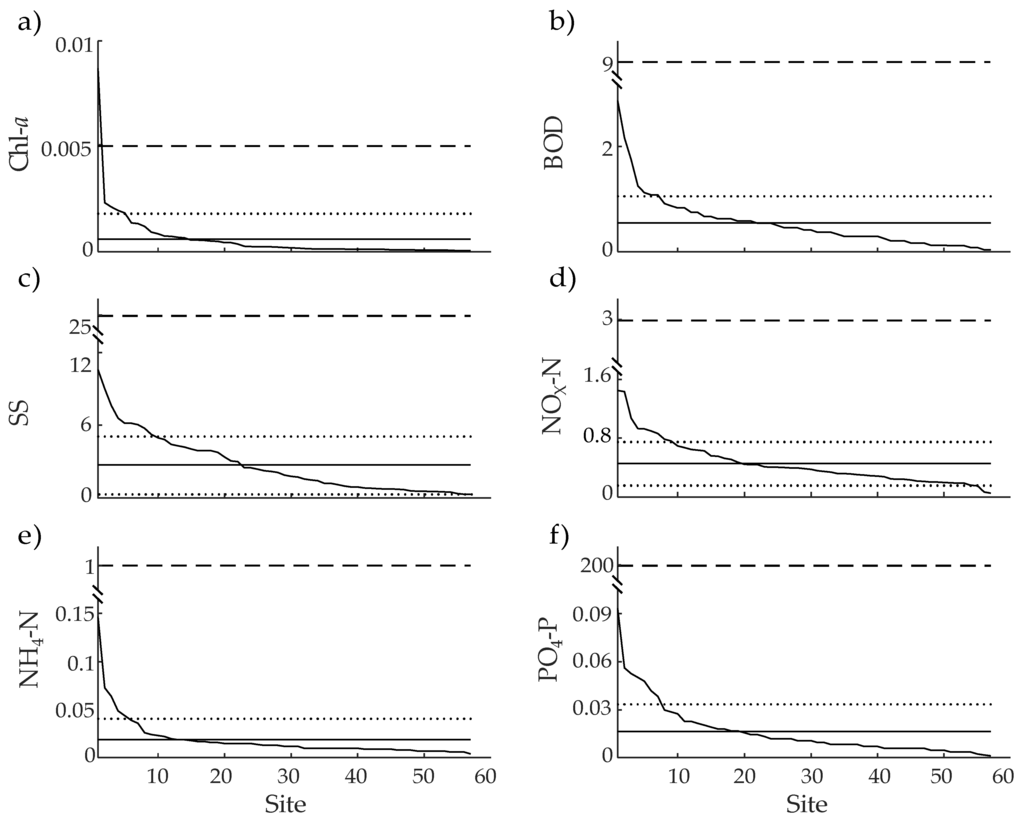 It was noteworthy that the maximum values of pollution at the sampling sites were not indicative of severe conditions but rather indicated a low degree of pollution (Table 3). The gradients of water quality indicators across all the sampling sites are presented in Figure A3. According to WHO standards [], water quality indicators measured in this study were substantially low. When the average values of the observed data were compared with the maximum level in the WHO standards, PO4–P and NH4–N showed the minimal range with 0.007%–1.880%. BOD had a somewhat higher level of 5.057% whereas NOx–N, SS, and Chl-a presented maximal levels of 15.817%, 12.016%, and 12.000%, respectively (Table 3). All observed measurements in this study, however, were substantially low compared with the WHO standards.