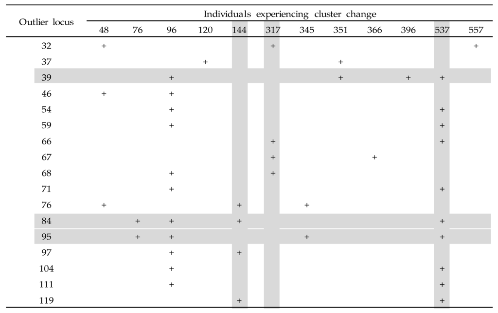 List of loci and individuals showing discrete values in cluster distance in Stenopsyche marmorata. Overlapping with four or more loci (or individuals) is represented by horizontal (or vertical) gray bars. The number of individuals is arbitrarily given.