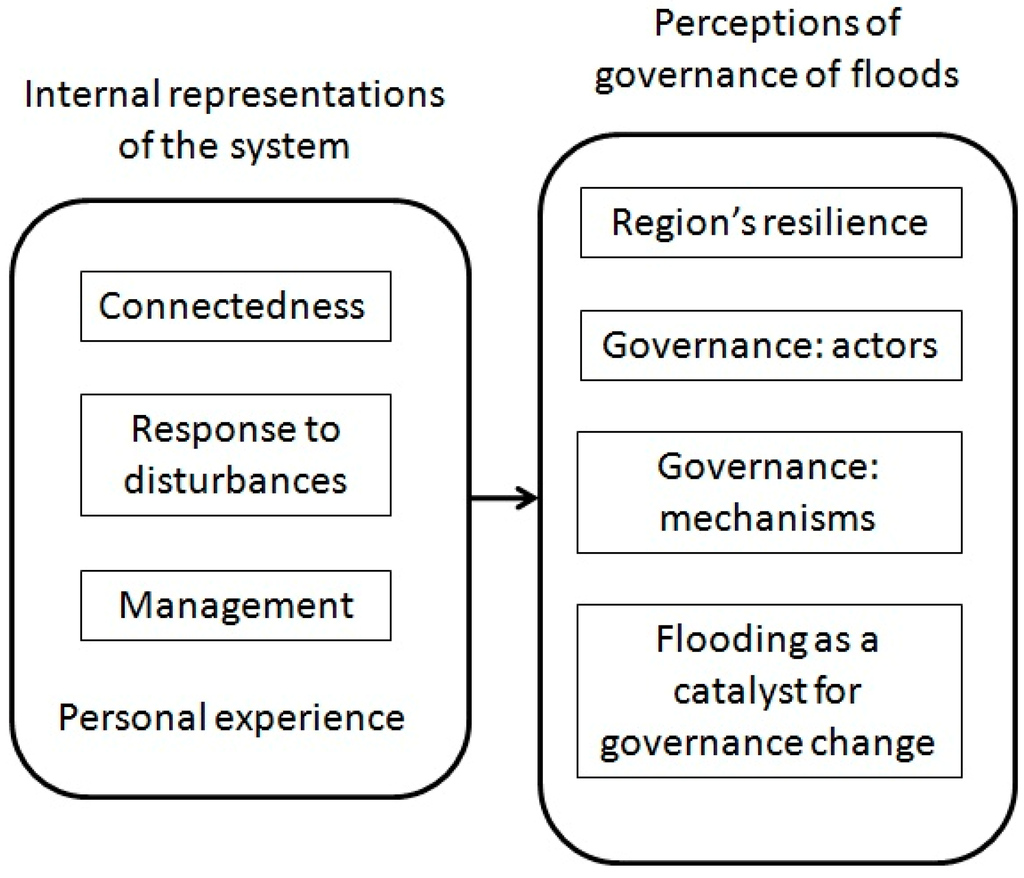 A shift appears to be occurring in thinking about flooding, from a resistance-based approach to one of resilience. Accordingly, how stakeholders in flood-prone regions perceive the system and its governance are salient questions. This study queried stakeholders’ internal representations of ecosystems (resistance- or resilience-based), preferences for governance actors and mechanisms for flooding, and the relationship between them in five different regions of the world. The influence of personal experience on these variables was also assessed. Most respondents aligned themselves with a resilience-based approach in relation to system connectedness and response to disturbance; however, respondents were almost evenly split between resistance- and resilience-based approaches when considering system management. Responses generally were considered to hold for other disturbances as well. There was no clear relationship between internal representations and preferences for governance actors or mechanisms. Respondents generally favoured actor combinations that included governments and mechanism combinations that included regulations and policies. Those who had personal experience with flooding tended to align themselves with a resilience-based internal representation of system management, but personal experience showed no clear relationship with governance preferences. The findings support an evolutionary perspective of flood management where emerging paradigms enhance preceding ones, and prompt a critical discussion about the universality of resilience as a framing construct.