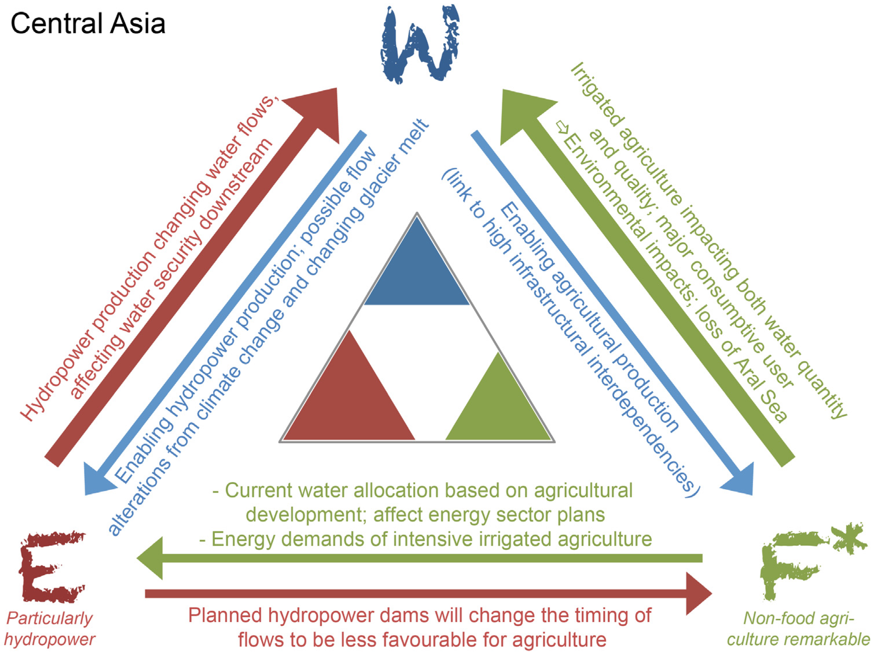 The nexus triangle for Central Asia, with key connections and impacts as well as current levels of security described with text. The F* indicates that food sector also includes a very important non-food crop i.e., cotton. See Figure 2 and text for explanation.