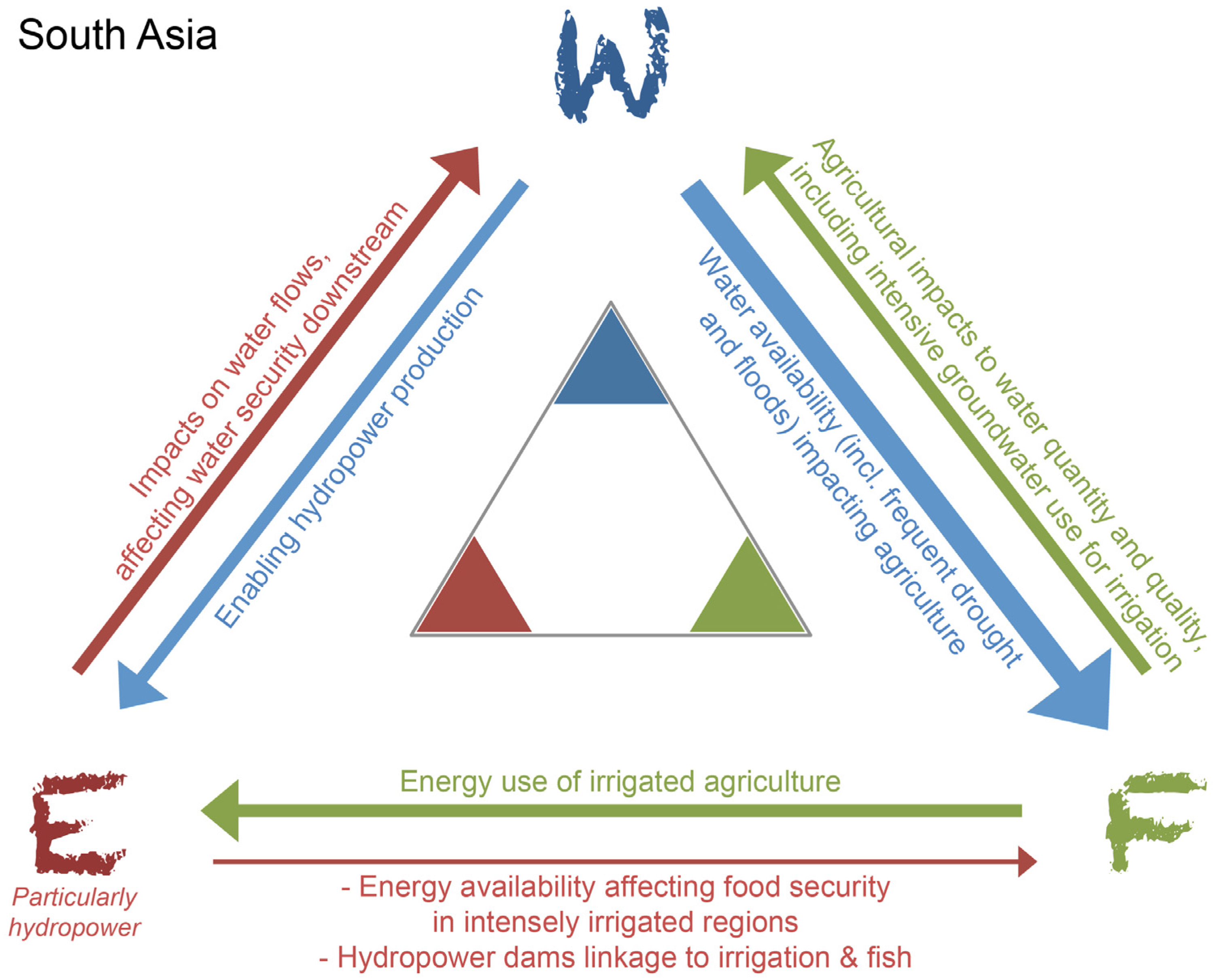 The nexus triangle for South Asia, with key connections and impacts as well as current levels of security described with text. See Figure 2 and text for explanation.