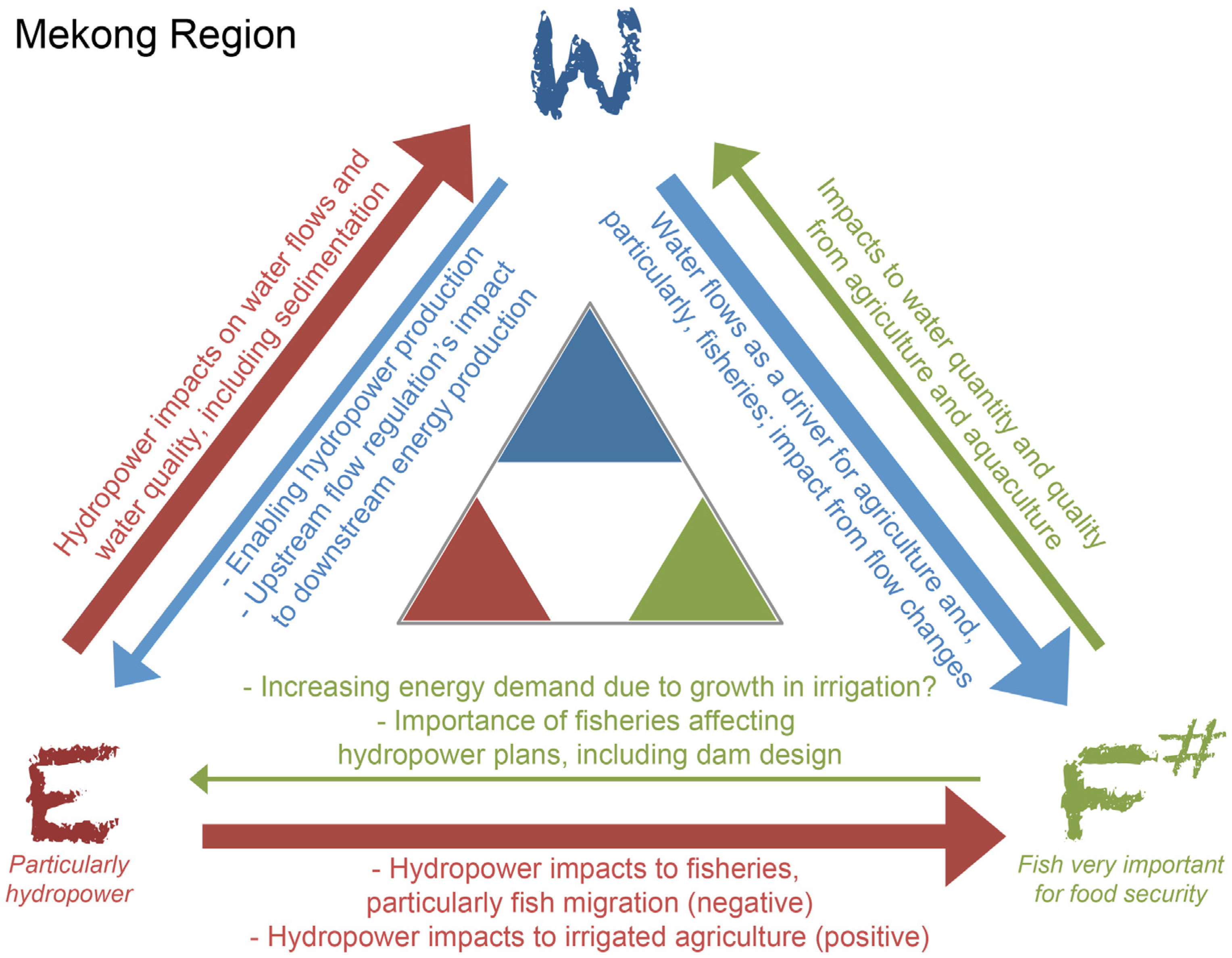 The nexus triangle for the Mekong Region, with key connections and impacts as well as current levels of security described with text. The F# indicates that fisheries’ role for food security is remarkable. See Figure 2 and text for explanation.