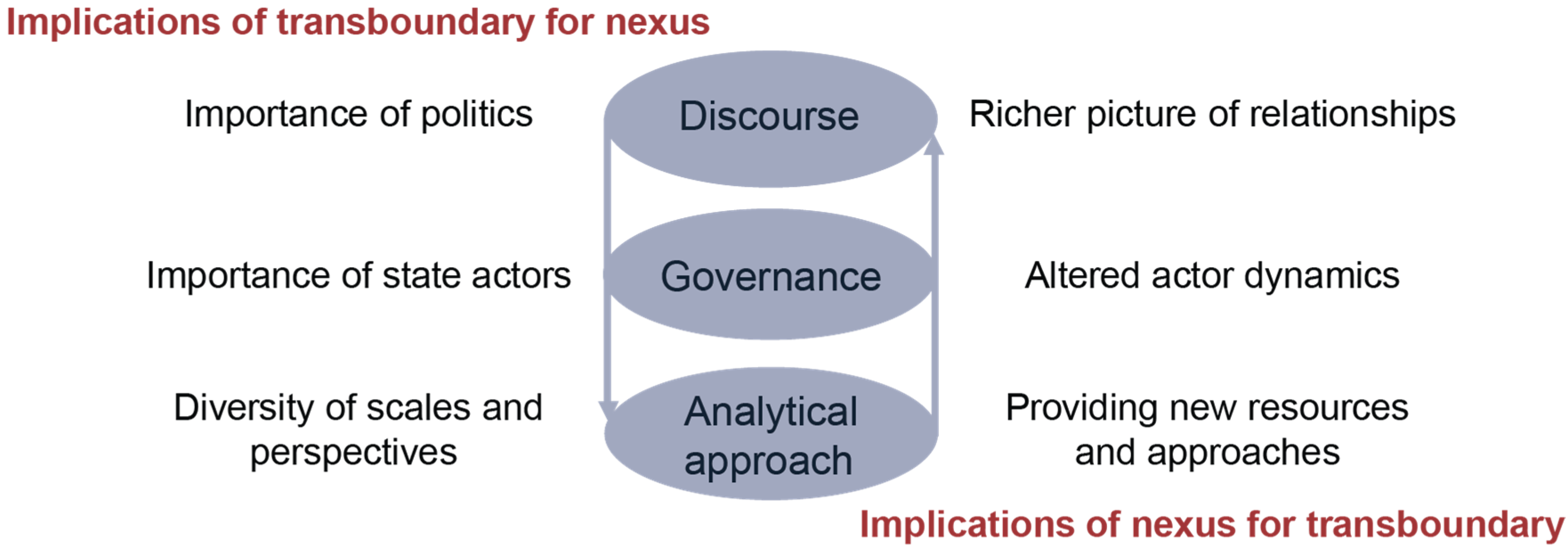 We then focused on the implications that transboundary context brings to the nexus as an approach and vice versa. Based on our comparative analysis of three Asian regions and related transboundary river basins, we concluded that the transboundary context has three major implications: the diversity of scales and perspectives, the importance of state actors, and the importance of politics. On the other hand, introducing the nexus approach in a transboundary context has the potential to provide new resources and approaches, alter existing actor dynamics, and portray a richer picture of relationships. These two sets of implications are linked, and also span the three perspectives on the nexus, demonstrating the usefulness of an integrated view (Figure 6).