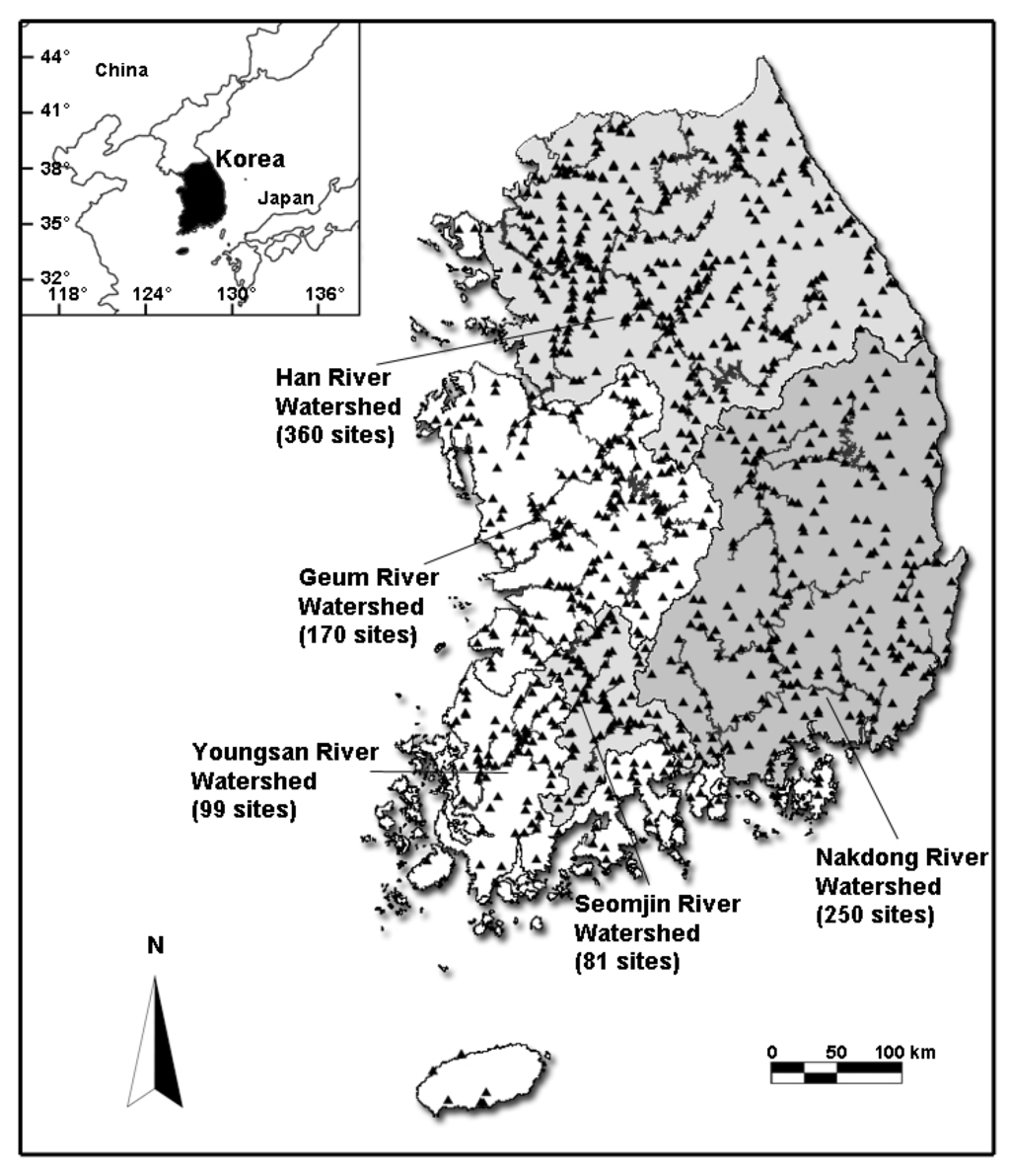 The monitoring sites in the five major rivers for the National Aquatic Ecological Monitoring Program in Korea. The triangles indicate 960 sites that are currently monitored.