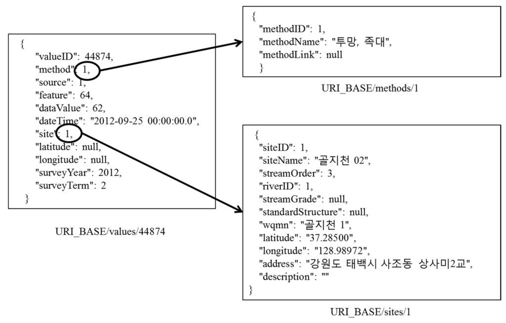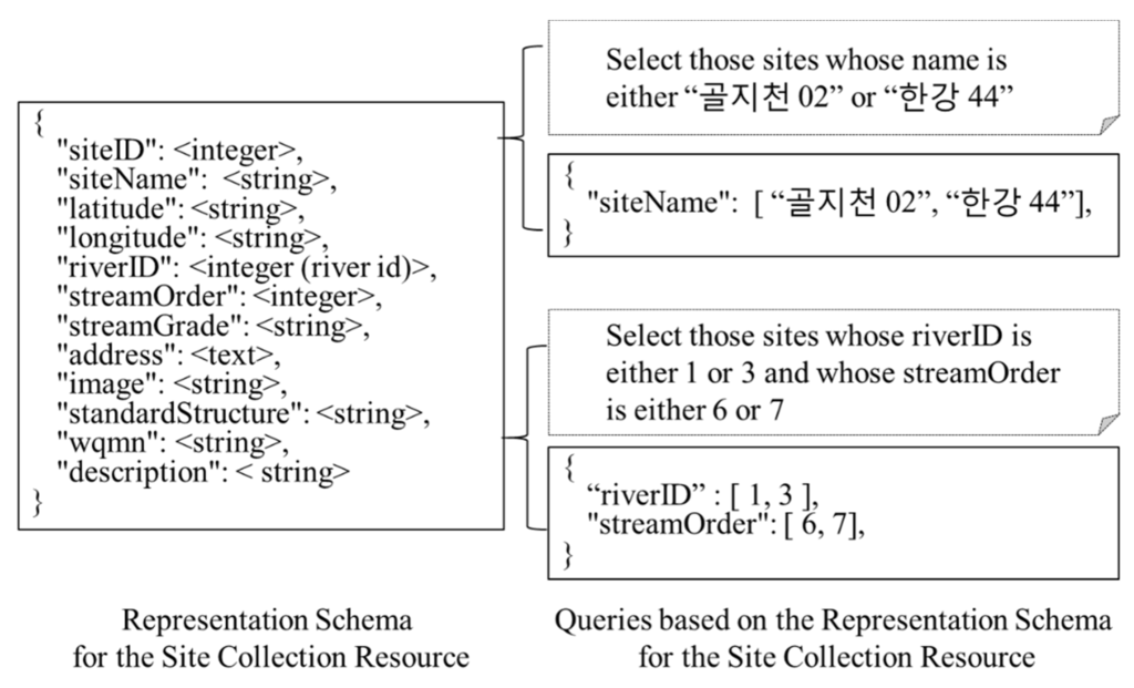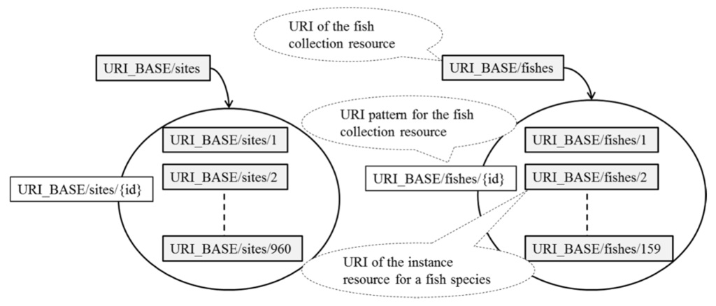 The organization of resources is illustrated in Figure 4 where two collection resources (Fish and Site) and their instance resources are shown. In the example, URI_BASE in URIs denotes the common prefix for every URI in OSAEM and is explained in Section 4.2. URI_BASE/fishes and URI_BASE/sites are the URIs of the Fish and Site collection resources, respectively. URI_BASE/fishes/1 and URI_BASE/sites/1 are the URIs of instance resources for specific fish species and site, respectively. The URI patterns are also explained in Section 4.2.