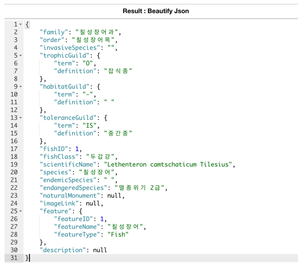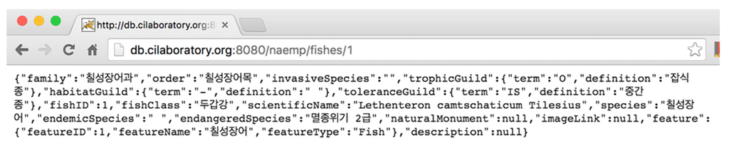 In OSAEM, a resource (either a real document file or a logical entity associated with a software service) is handled as a data object (or a document) at run time. Therefore, every resource must be defined and handled as if it were a real document. For example, if a human user enters the URI of the resource for the fish species Arctic lamprey (in fact, URI_BASE/fishes/1) into the URL bar of a web browser, then the user will receive a document (i.e., data) for the resource. Figure 5 gives a snapshot of a web browser window displaying the data for the fish species Arctic lamprey. Web browsers do not print the data in a readable format with proper indentations and line breaks; the same data is well formatted in Figure 6. Such a formatting service (e.g., http://codebeautify.org/jsonviewer) is available online.
