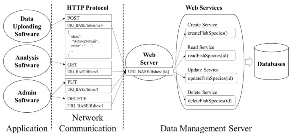 In this paper, we present a data management system called OSAEM (the Open, Sharable and Extensible Data Management System for Aquatic Ecological Monitoring) designed to facilitate and promote the sharing of NAEMP datasets. Furthermore, the design of the OSAEM system focuses on enabling a variety of software systems, rather than human users, to access the NAEMP datasets as easily and flexibly as possible. Data management in the OSAEM system is based on the web technology called the RESTful API [10,11]. There are a number of active efforts to apply the RESTful API technology to the management of scientific and engineering data [12,13,14,15]. In these efforts, the RESTful APIs are used to support the efficient management of software services. As such, the conventional RESTful APIs are service-oriented.