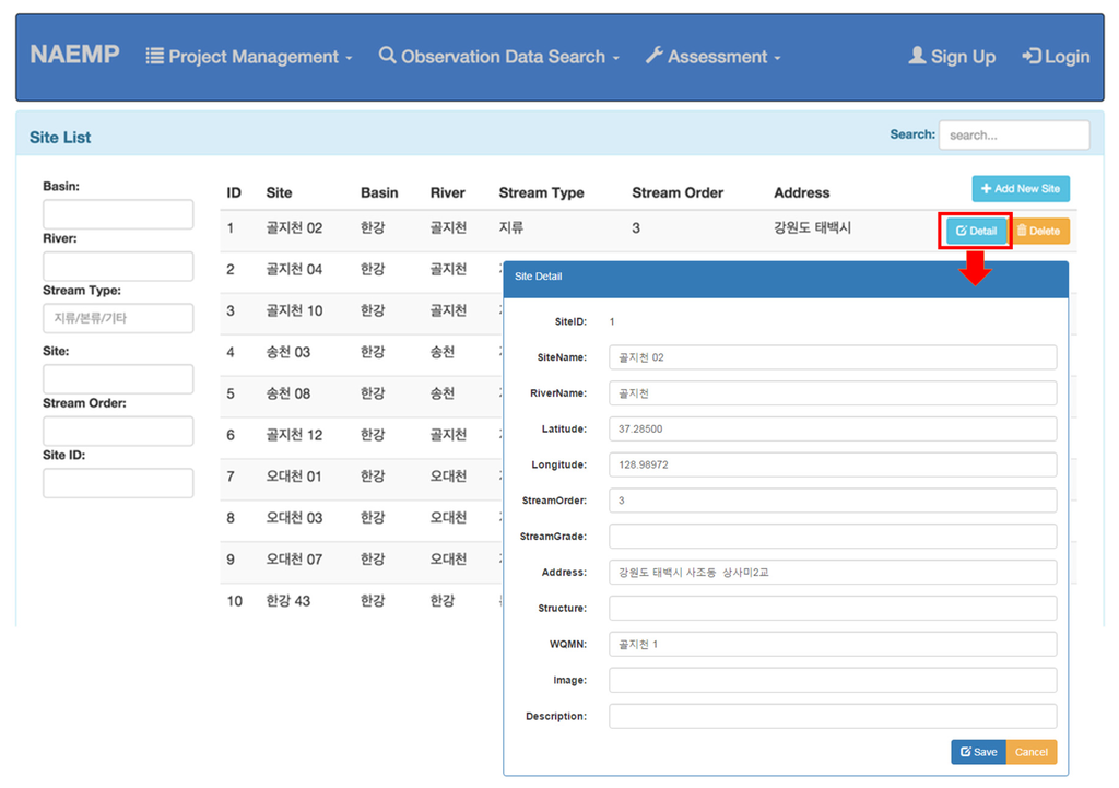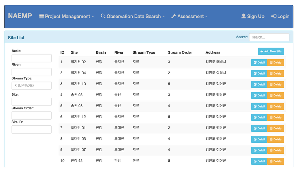 Due to the standardized protocols and methods applied to every monitoring site, the datasets in NAEMP have great potential and value as reference datasets for various ecological studies and management. However, NAEMP currently lacks effective dataset management and data services for other ecological studies. Currently, the datasets are managed as spreadsheet files (i.e., Microsoft Office Excel files) in NAEMP. Excel Macro programs embedded in the dataset files are used to generate biological health indices. Such spreadsheet file–based management of datasets is very simple, easy, and flexible, but inevitably ad hoc and error-prone. With this data management approach, it is very difficult to search for or locate data items of interest in the datasets, to share only some parts of the datasets (e.g., excepting sensitive or private data) with other users or information systems outside the NAEMP, and to support extensions to ecological monitoring such as the addition of new living organisms, sites, or methods.