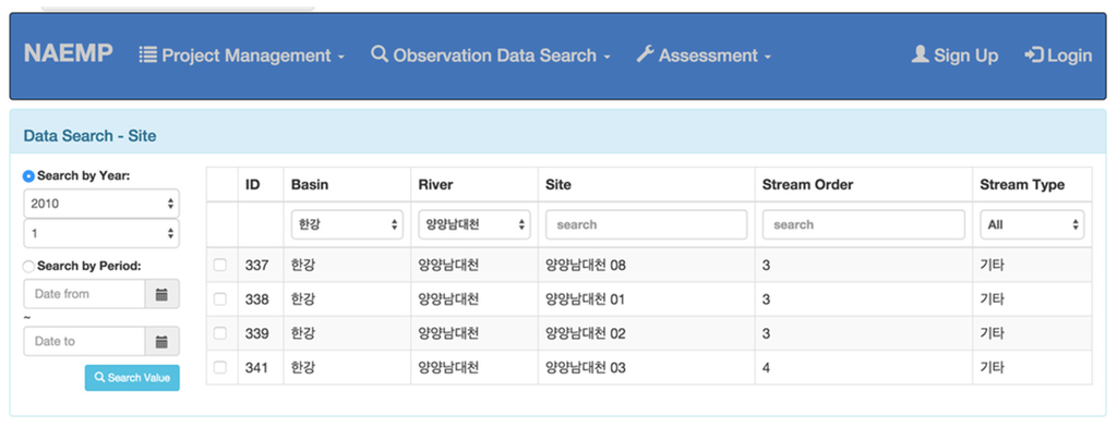 Finally, if the datasets in NAEMP are used as a kind of reference data for other aquatic ecological studies in Korea, other users or information systems for other projects outside NAEMP will need to access the datasets in NAEMP. For example, there may be new synthetic analyses to integrate data from NAEMP and those from other projects. Such data integration must be supported in an easy and efficient manner.