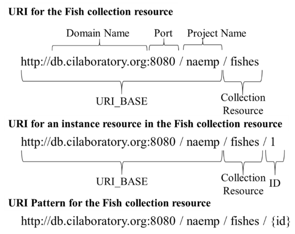 Second, the URI for every instance resource in the same collection resource is based on the same pattern called the URI pattern. Therefore, each collection resource is associated with the URI pattern shared by the instance resources. The URI pattern for a collection resource consists of the URI for the collection resource and a variable (i.e., a placeholder) for a system-assigned numeric ID for a specific instance resource. In Scheme 1, the URI pattern for the Fish collection resource is URI_BASE/fishes/{id}, where {id} denotes a numeric ID for an instance resource. The URI for an instance resource (i.e., a fish species) in the Fish collection resource is URI_BASE/fishes/1.