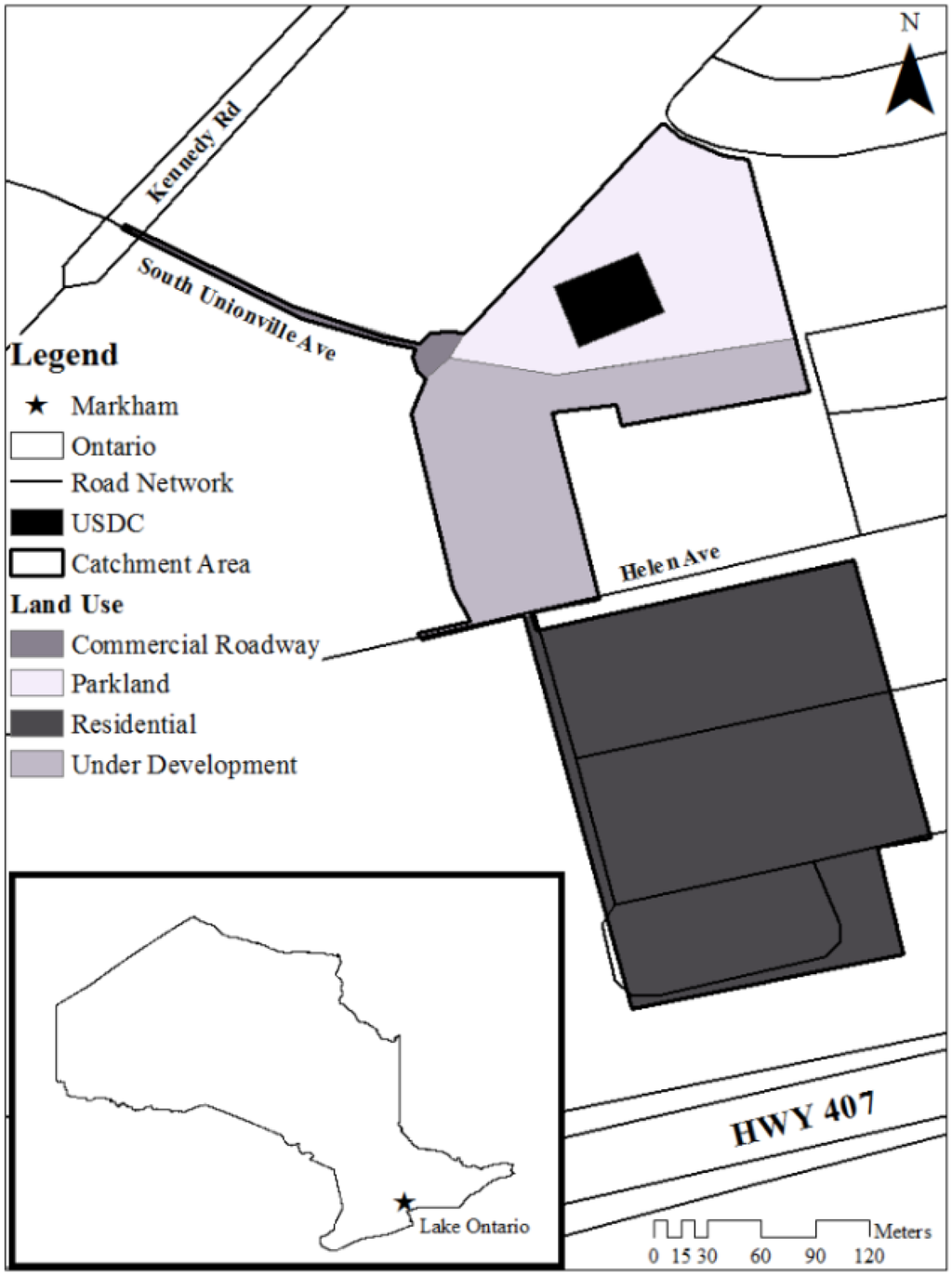Temperature and turbidity were recorded at the inlet and outlet approximately 1.35 m from the bottom of the USDC. Monitoring was conducted from the beginning of June to the end of November 2014. Precipitation measurements were taken at Milne Dam in the City of Markham, which is three kilometers east of the site.