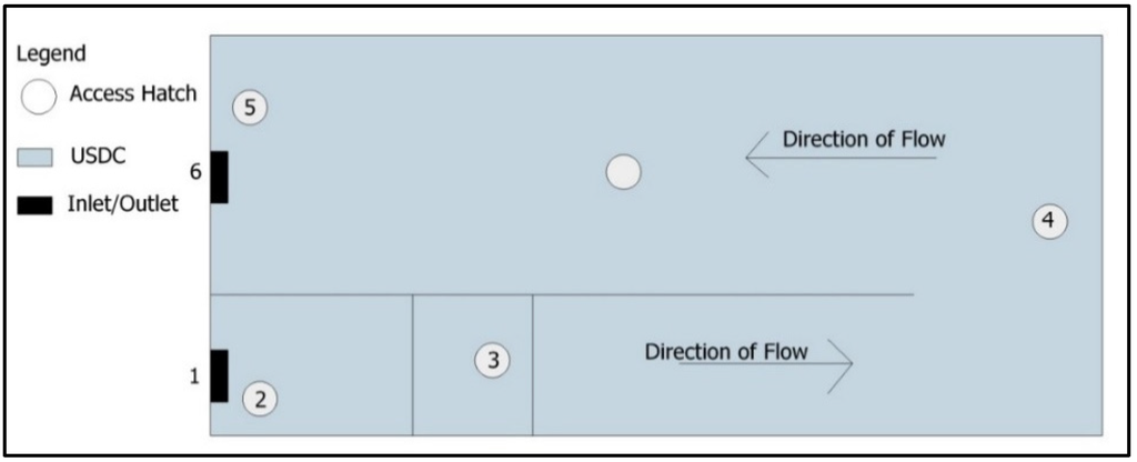 The various concrete structures within the USDC change the flow path of the water, which causes turbulence and may or may not assist in the removal of contaminants. USDC are not open to the environment so they are not affected by solar radiation. Therefore, the thermal issues with SWM ponds, such as elevated effluent temperature and thermal gradients [1,13,14,15,16] may be avoided. All of these factors combine such that the conditions within a USDC need to be researched as a separate entity to the SWM pond.