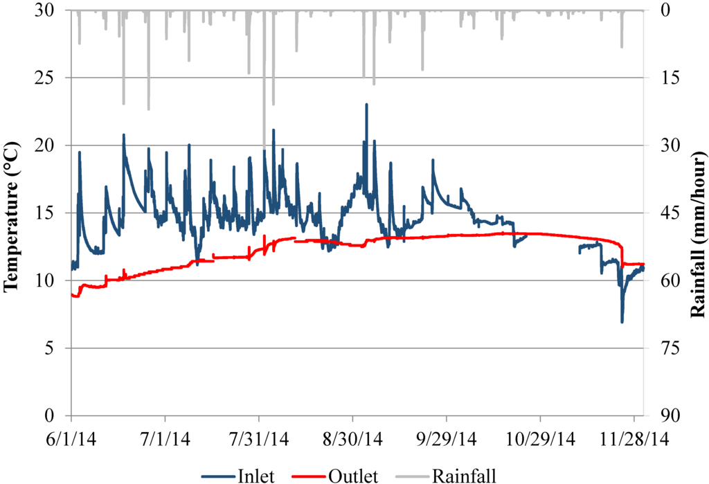 During the fall (October and November) inlet and outlet water temperatures were very similar; averaging 13.8 °C and 13.2 °C during runoff events, respectively. Outlet temperatures were extremely uniform during the fall while inlet temperature were more variable ranging from 7 °C to 17 °C. Cold water species (e.g., brown trout, brook trout) require water temperatures of 13 °C or cooler for spawning during October and November [24]. Therefore the USDC mitigated thermal enrichment during rain events over these months also, particularly in October, to such an extent that outflow water could be released to a downstream receiving waterbody where coldwater fish spawning habitat exists.