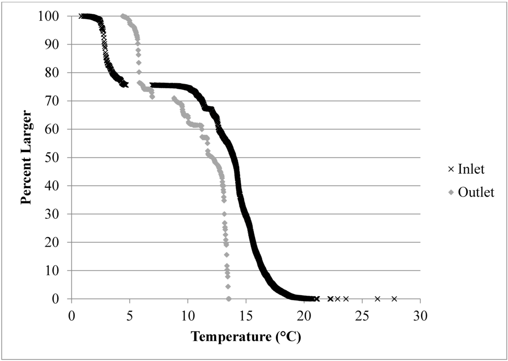 Probability plot of inlet and outlet water temperature over the entire monitoring period.