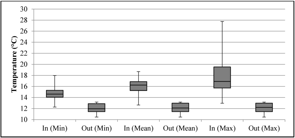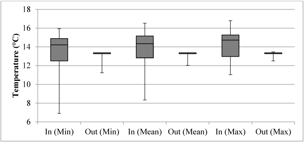 Figure 5 and Figure 6 present box plots of minimum, mean and maximum inlet and outlet temperatures during summer and fall runoff events, respectively. Relative to previous case studies of a USDC [1] the observed outlet temperatures were very cool. For summer storms the most significant thermal effect is a pronounced reduction in event maximums. On average, outlet maximum temperatures were 5 °C cooler than inlet maximum temperatures. Additionally, event mean and minimum temperatures were typically reduced by 4 °C and 2.7 °C respectively. It is important to recognize that the cool outlet temperatures observed by at the South Unionville USDC are influenced by the oversizing of the USDC. The temperature of the outflow eliminates the release of thermally enriched runoff and would be appropriate for discharge into coldwater streams [22,23]. For the general protection of aquatic life, daily mean temperatures of 18 °C and a maximum daily temperature of 19 °C is recommended [24]. Over the study, two events had inflow temperatures that exceeded the daily mean temperature guideline. More significantly, ten events had inflow temperatures that exceeded the daily maximum guideline. Outflow from the USDC never exceeded 13.5 °C demonstrating that the system provided a significant thermal buffering benefit.
