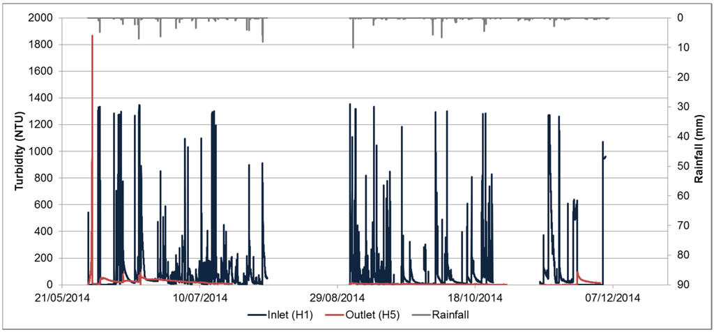 The turbidity of inlet and outlet flows was also continuously monitored over the summer and fall (Figure 7, Figure 8, Figure 9 and Figure 10). In total thirty-eight turbidity events were observed.