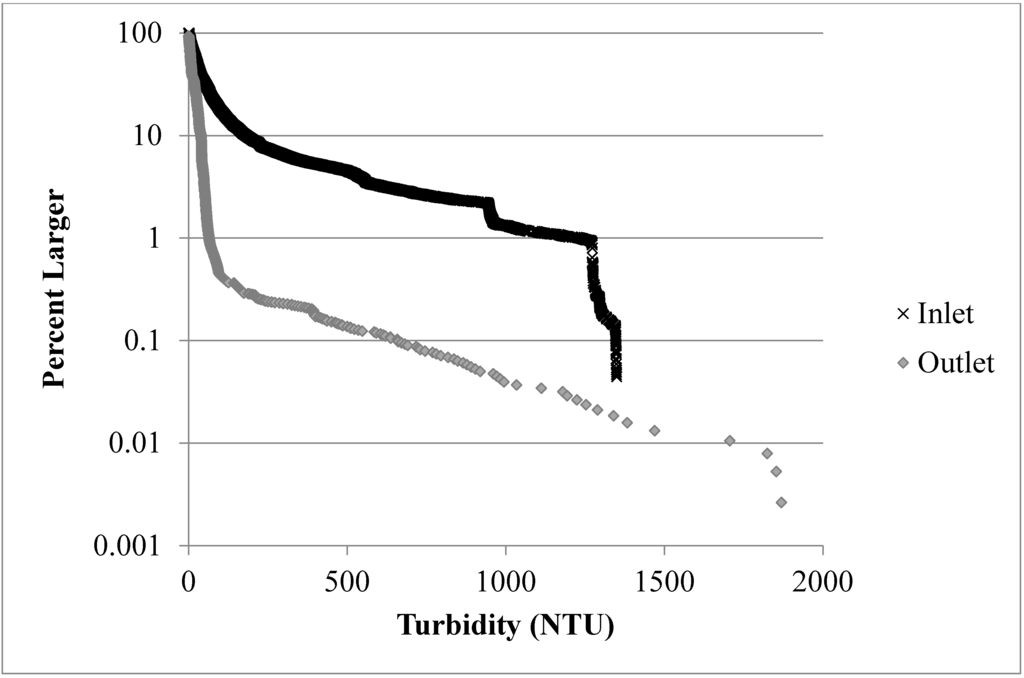 Probability plot of inlet and outlet turbidity for the entire monitoring period.