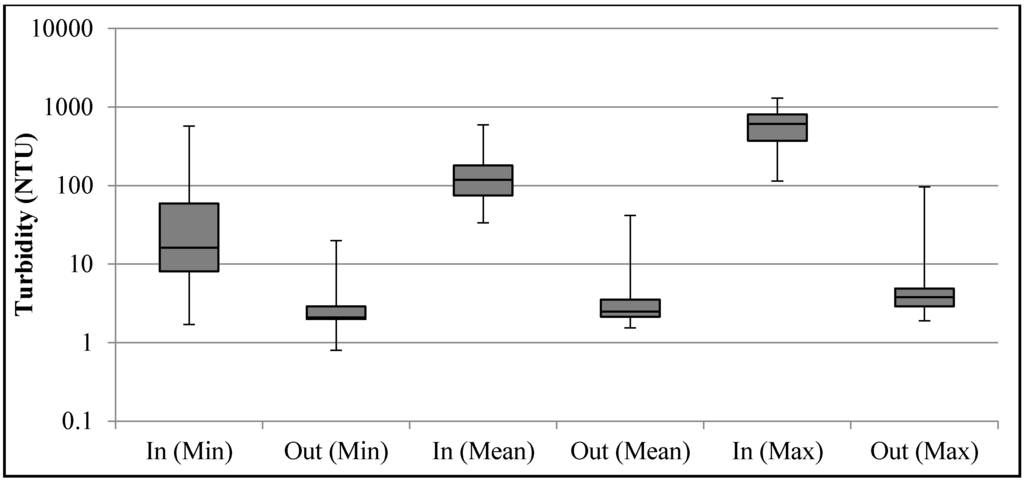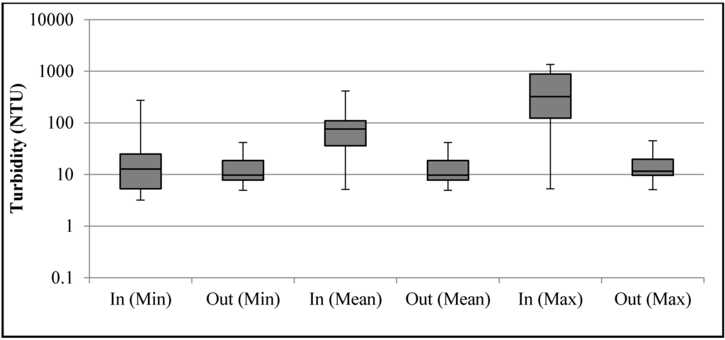 Summer inlet and outlet turbidity during runoff events: minimum, mean and maximum.