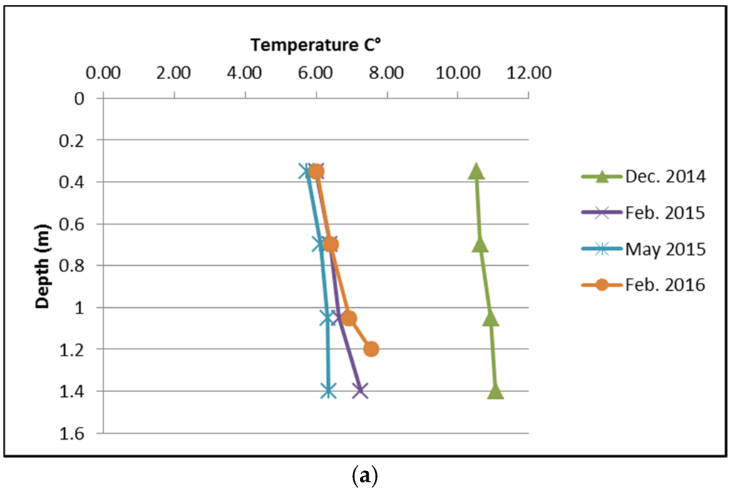 Descriptive statistics were calculated for continuous temperature and turbidity data as well as for pollutant EMC data. Unfortunately, the configuration of the USDC inlet did not allow for flow monitoring so event mean temperatures and turbidity cannot be flow-weighted. Vertical profiles of temperature, specific conductivity/total dissolved solids, dissolved oxygen and pH were taken during winter and spring seasons between 2014 and 2016 in the permanent pool portion of the USDC (Hatch 4 on Figure 2). Profile data collection was scheduled to determine if water stored in the permanent pool becomes stratified for any of these parameters during winter operation, and if any observed stratification dissipates with the arrival of spring rain storms. Four vertical profiles were conducted on the South Unionville USDC; they took place on 2 December 2014, 18 February 2015, 4 May 2015, and 23 February 2016.