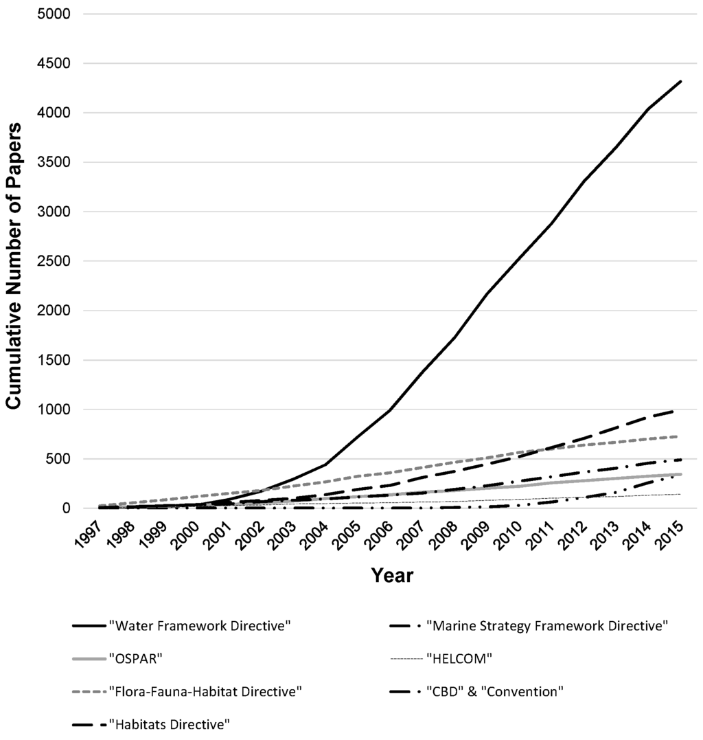 Comparison of the cumulative number of scientific publications referring to the Water Framework Directive (title, keywords, abstract) and other EU Directives, International Conventions on the Protection of the Marine Environment for the North Sea (OSPAR) and the Baltic Sea (HELCOM), the Habitats Directive, and the Convention on Biological Diversity (CBD) (Source: www.scopus.com, queried in December 2015).