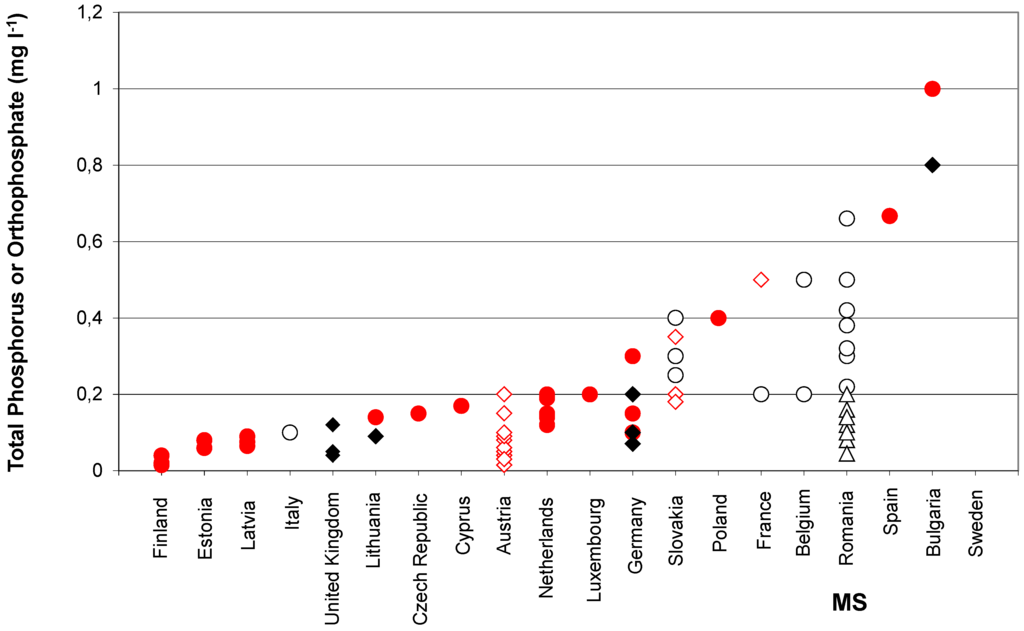 Total phosphorus or orthophosphate values for good-moderate boundaries of ecological status in European streams and rivers. Filled circles = Total phosphorus as annual mean values or mean values for defined seasons or no entry. Open circles = Total phosphorus as 90 percentile values of annual measurements. Triangles = Total phosphorus median values. Filled diamonds = Orthophosphate/soluble reactive phosphorus as annual mean values. Open diamonds = Orthophosphate as 90 percentile values of annual measurements. Values provided by CZ, FR, BG, PL, LT, LU, CYP and IT are good-moderate boundaries set for “All rivers” (without typological differences). Multiple points for other MS denote good/-moderate boundaries set for different river and stream types. Sweden reported good-moderate boundaries as EQR (not shown). Spain reported a value with unknown unit of measurement (mg/L−1 or EQR). UK values refer to soluble reactive phosphorus.