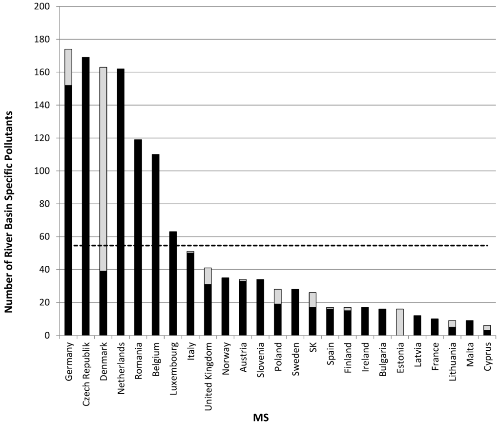 Number of river basin specific pollutants of the Member States as reported to the EU Commission within the first management plan period (black bars after Arle et al., 2012 [22]) and updated numbers based on MS requests (grey bars after Irmer et al., 2014 [23]). Dotted line = mean number of substances used by the MS as RBSPs, after Irmer et al., 2014 [23].