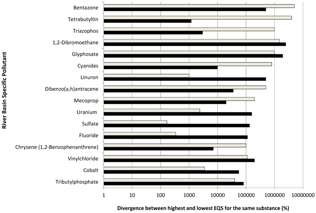 Divergence (in %) between minimum values and maximum values of EQSs for RBSPs reported by different MS. 16 substances are shown exemplary. Medium of measurement for the substances = water. Grey bars = values reported by Arle et al., 2012 [22], Black bars = values reported by Irmer et al., 2014 [23]. Under the WFD, EQSs for RBSPs are derived according to fixed rules which should eliminate flexibility in the determination of standard values. Similar to the quality standards for substances under the chemical status classification, the EQSs for RBSPs should show identical values.