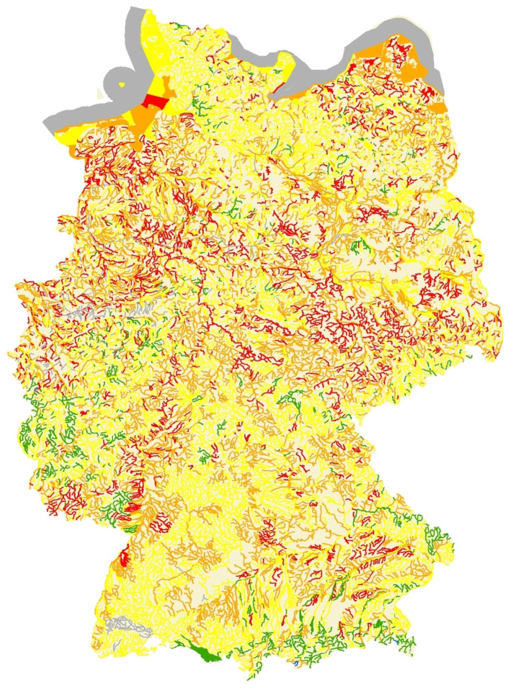Ecological status/ecological potential of surface water bodies in Germany. Blue color = very good status; Green color = good status/potential; Yellow color = moderate status/potential; Orange color = poor status/potential; Red color = bad status/potential; Grey color = status/potential unknown. Source: Federal Environment Agency after data from the German reporting portal WasserBLIcK/BfG 2015.
