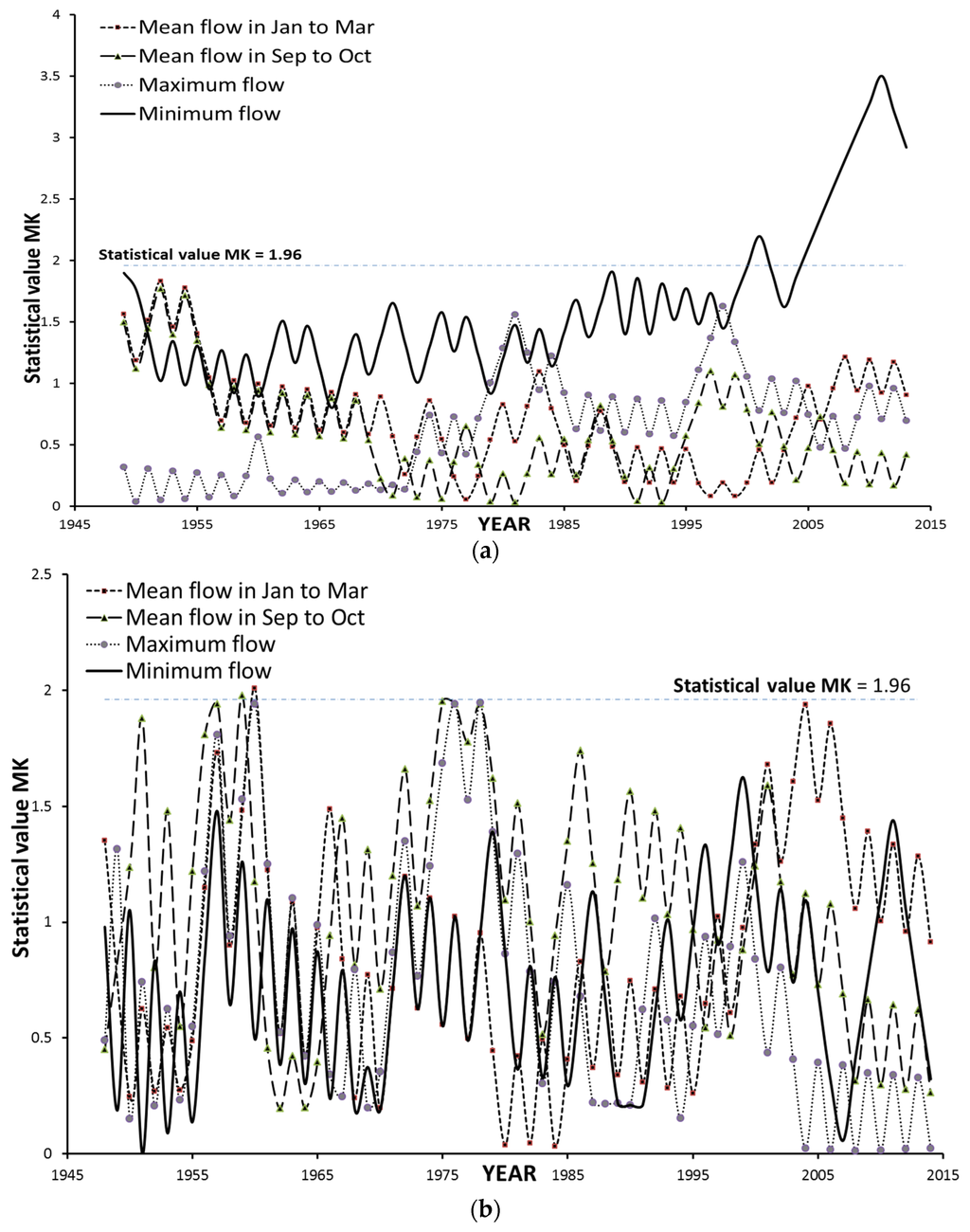Figure 3 shows that no significant change has been detected in the series of mean flows during the dry season, the post-freshet period, or the annual maximum flow at Yichang station. However, the annual minimum flow has undergone significant change after 2000, as it has increased after 2004 with the MK value above 3.5.
