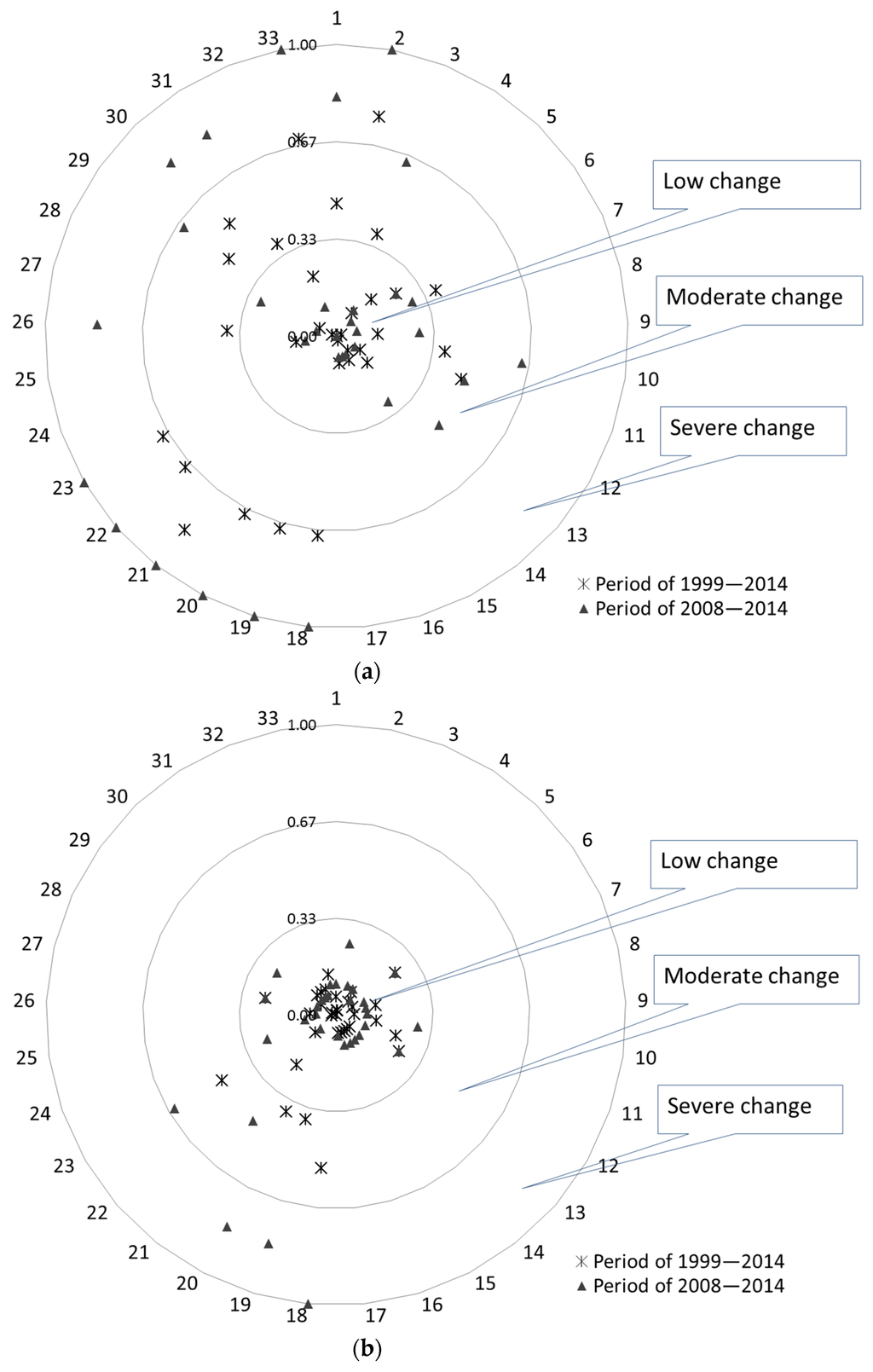 i.e., low change factors close to the center, moderate change factors in the middle, and severe change factors in the outermost. The sequence of 33 IHA factors in