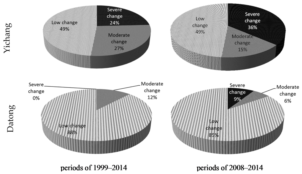 The factors with low, moderate, and severe changes during 1999–2014 at Yichang and Datong stations are plotted in