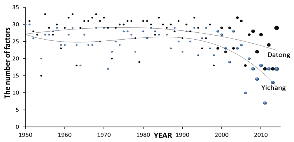 Figure 6. The gray dots show the number of factors at Yichang station, and the black dots denote the number of factors at Datong station in the normal range. In order to highlight the trend in recent years, the number of factors is marked with larger dots, as shown in