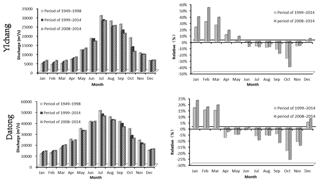The comparison and anomaly of monthly mean flow during 1999–2014 as well as 1949–1998 at Yichang and Datong stations are shown in