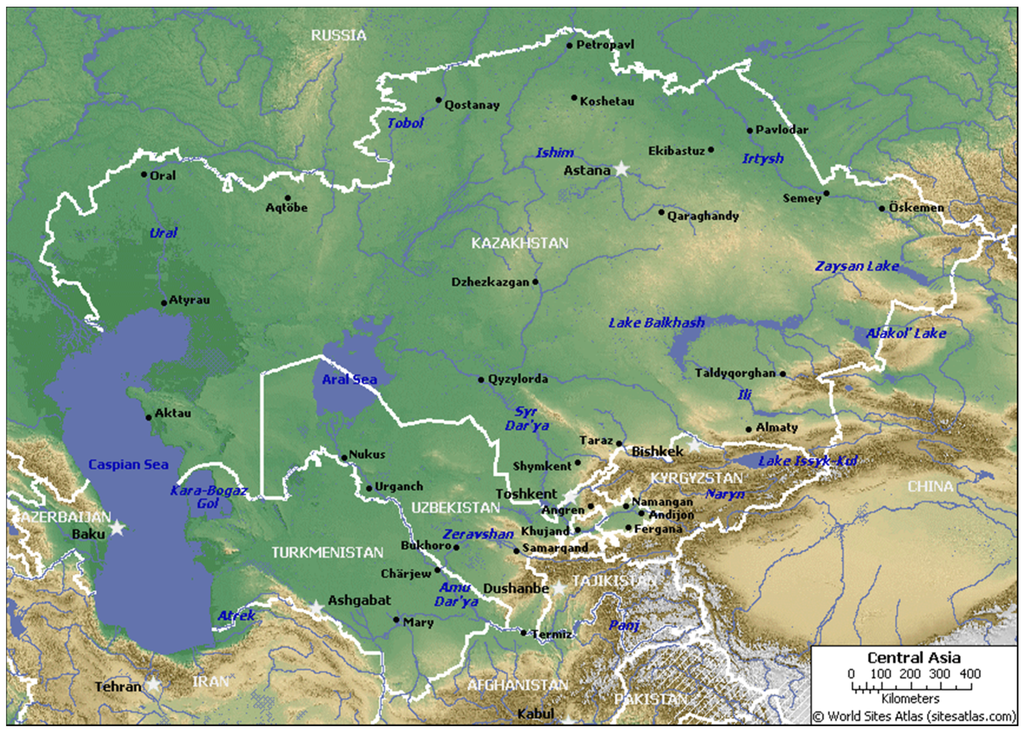 Outline of Central Asia and the five former Soviet Union states Kazakhstan, Turkmenistan, Uzbekistan, Tajikistan, and Kyrgyzstan (courtesy of World Sites Atlas).