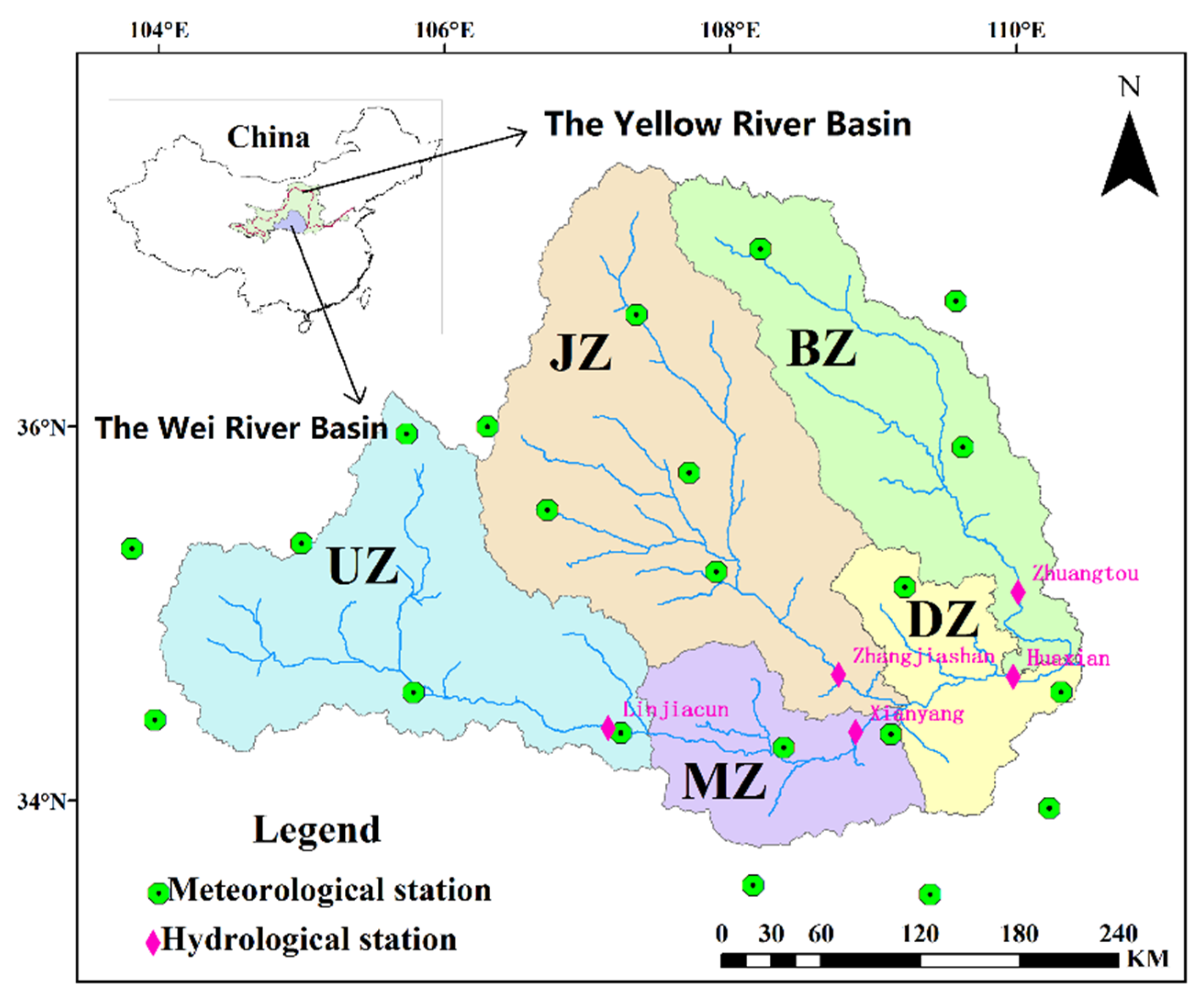 The Wei River Basin (WRB), a typical arid to semi-arid region in northwest China, is a key economic development zone and an important agricultural production area. It hosts 76 major cities with a total population of 22 million people. Furthermore, the Wei River, known as the “mother river” of Shaanxi Province, is a major source of domestic and industrial water. In recent decades, many studies [