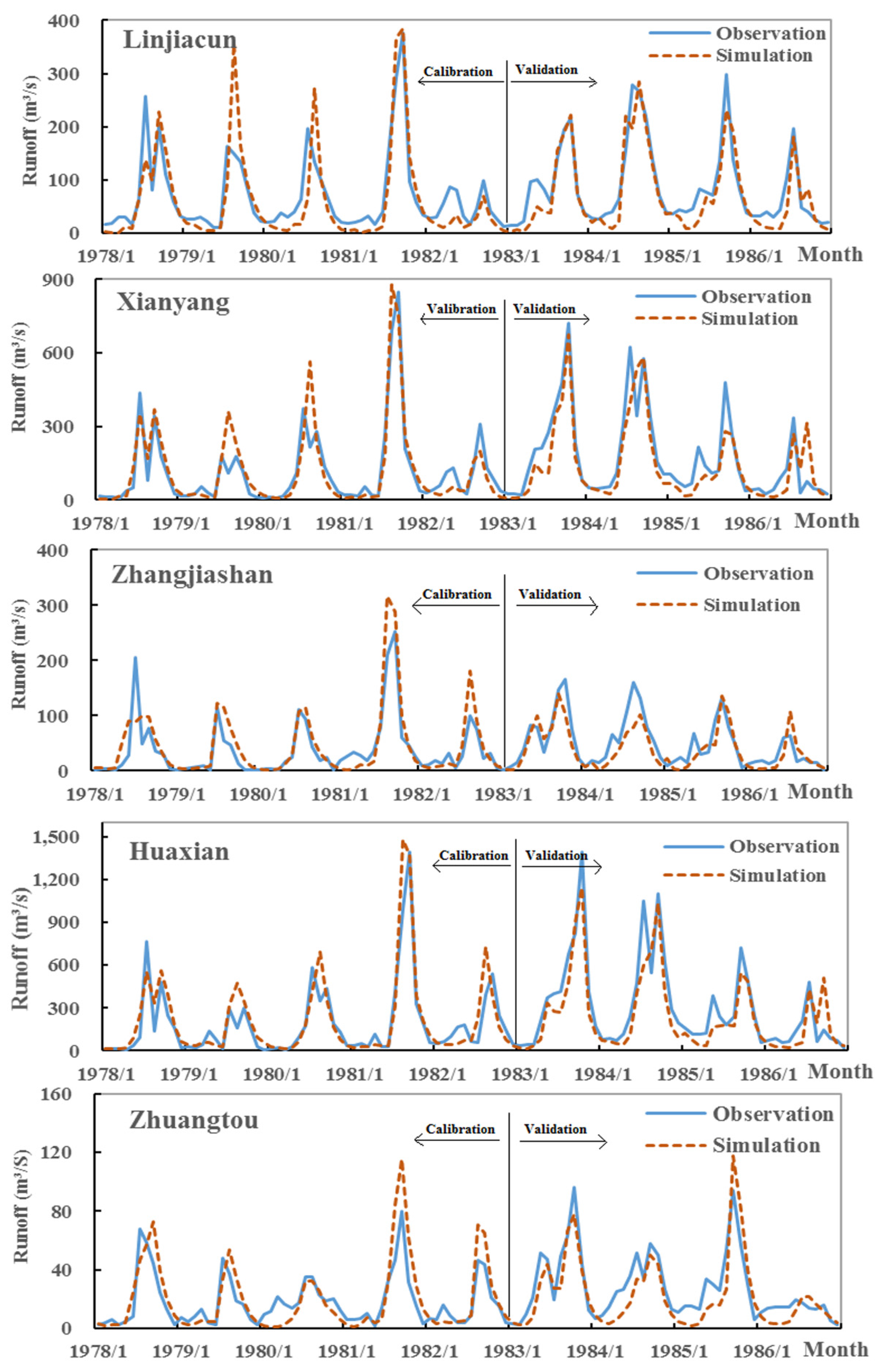 In this study, simulation performance was limited by three factors. First, there are many uncertain factors within the model; these include the spatial data (the DEM and soil and land cover maps) and the meteorological data (precipitation and temperature). Second, the model uses numerous generalized and empirical formulas to characterize complex hydrological processes, which can negatively affect the results. Finally, the hydrological model is highly complex, with 26 parameters, and a calibration period including nine years of data is likely too short to properly calibrate and validate the model at a monthly scale.