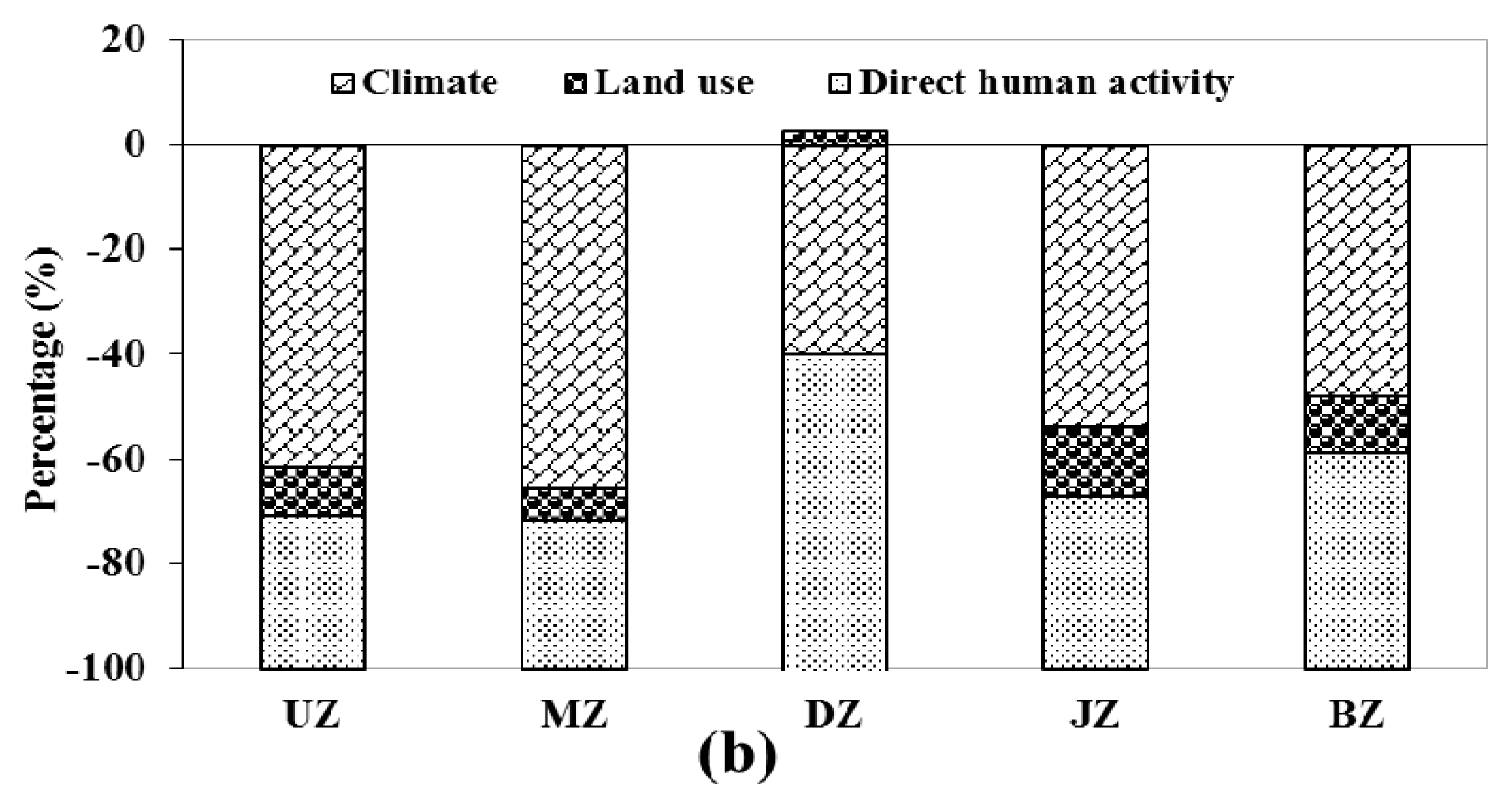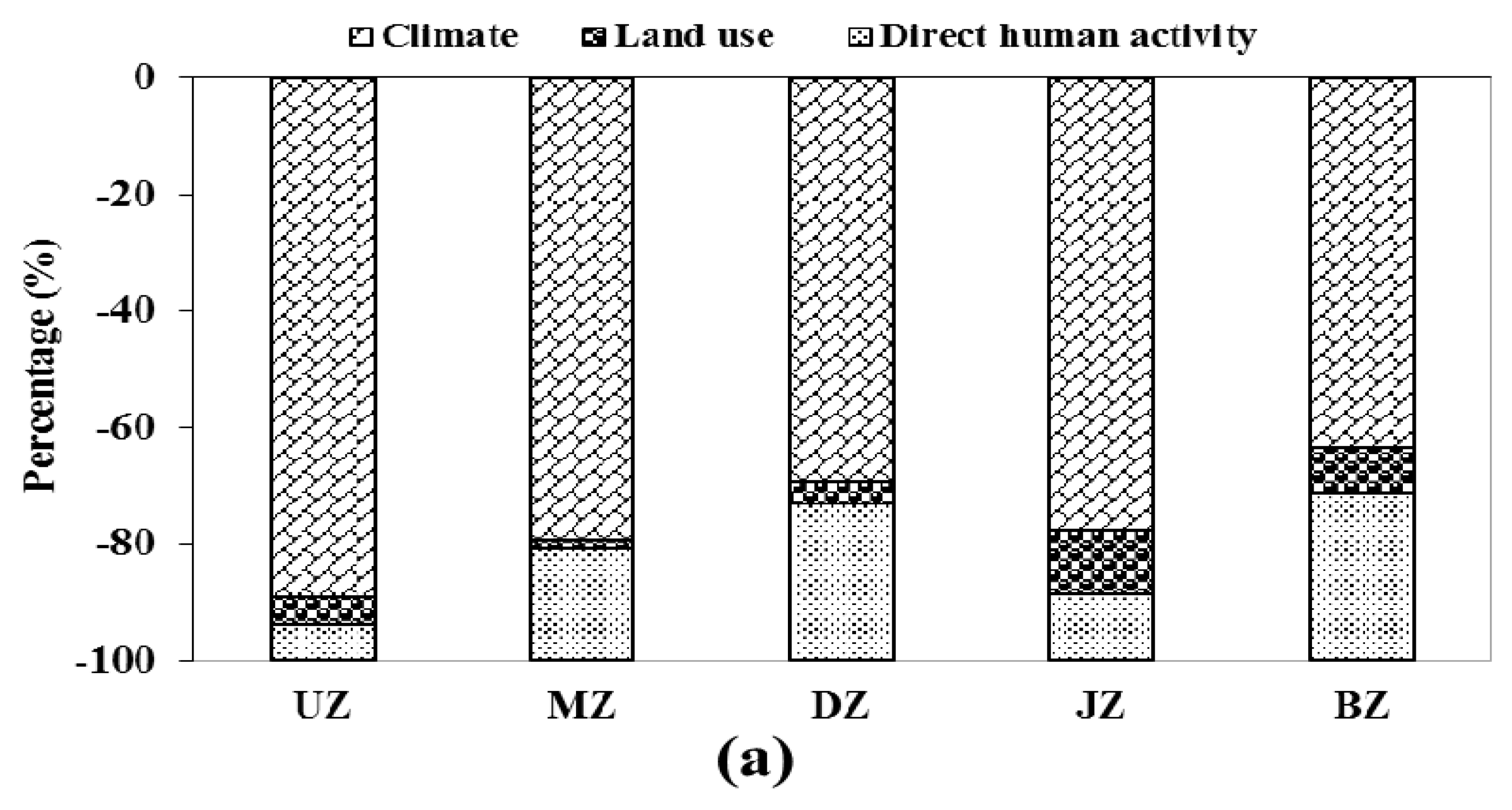 During the 1990s, the temperature in all sub-zones increased by 0.5 °C–0.6 °C; precipitation decreased sharply, ranging from 40 mm to 60 mm. Precipitation in the UZ decreased the most, by 60 mm, while precipitation in the BZ decreased the least, by 40 mm. These data explain why the impact of climatic variation on runoff during the 1990s is largest in the UZ at 89.26%. In the BZ, its impact is smallest (60%). During the 2000s, temperatures in all sub-zones continued to increase, from 1.0 °C to 1.2 °C. Precipitation also decreased but by a similar amount over all five sub-zones, ranging from 20 mm to 30 mm. Compared to the 1990s, precipitation in all sub-zones increased slightly, which could account for the weakened impact of climatic variation during the 2000s. Overall, the reduction in runoff due to climatic variation is the consequence of increased temperature and decreased precipitation. Spatial discrepancies in the impact of climate are mainly caused by differences in precipitation among the five sub-zones.